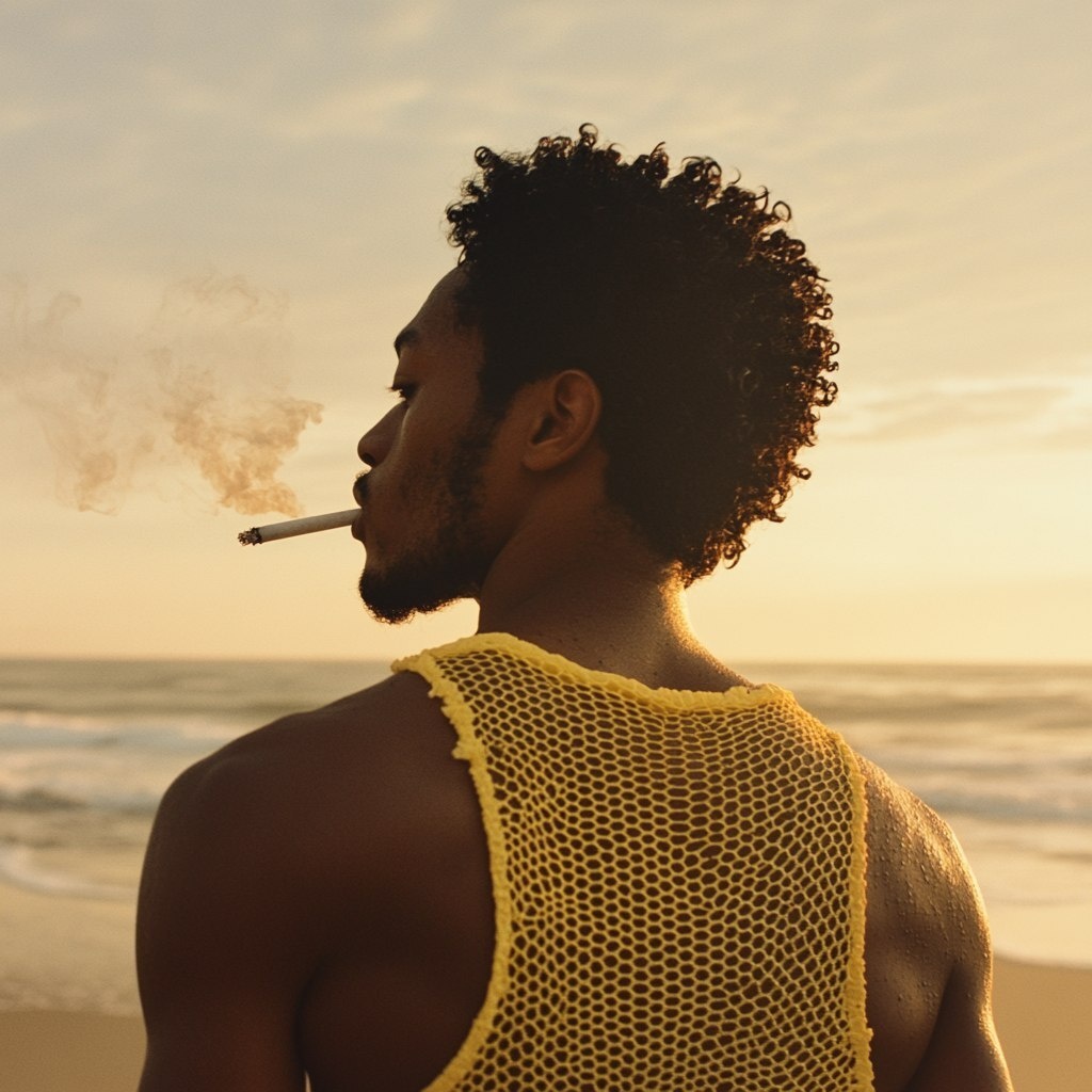 Создано на основе запроса: a black man in his mid 30's smoking while walking on the beach. He is facing backwards. He is wearing a fishnet style yellow tank top. Sunset time. --- Автоперевод: Черный мужчина в середине 30 -х годов курит во время прогулки по пляжу. Как тебе эта генерация? 🤔 https://dzen.ru/id/65c0c65c86e4f837c27b24d7 #ИИ #AI #нейросеть #midjourney #art
