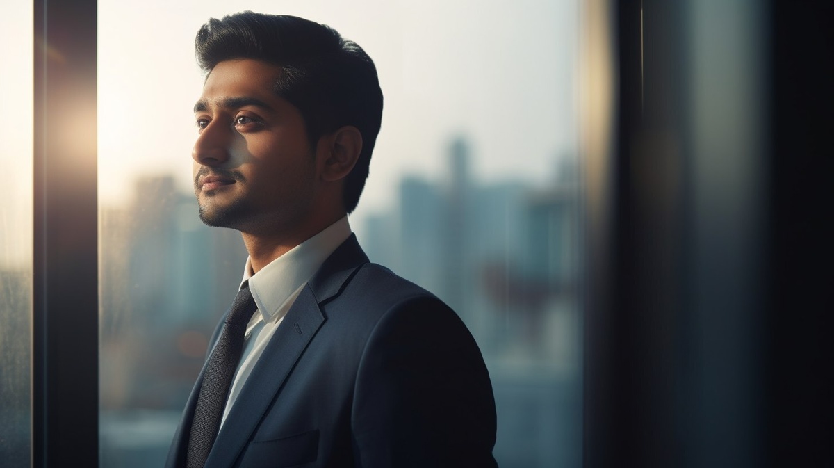 Создано на основе запроса: An Indian corporate boss standing by a glass office window, soft sunlight casting a warm glow on his face