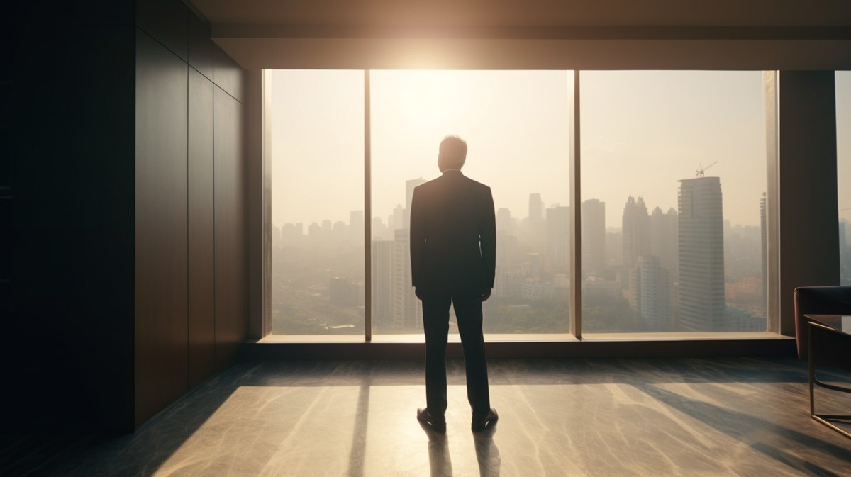 Создано на основе запроса: ack view of an Indian corporate boss standing near a large office window, soft sunlight streaming in and casting