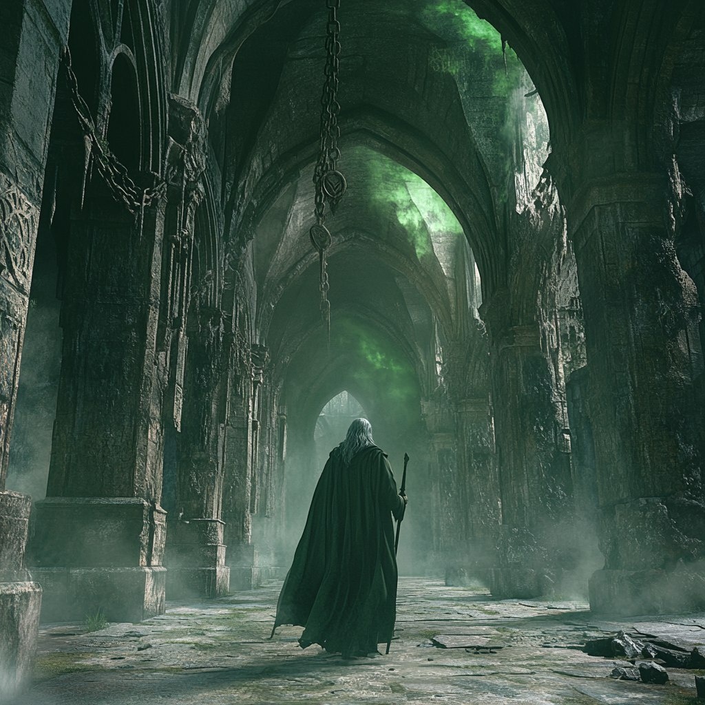Создано на основе запроса: Gandalf the Grey walking alone through a massive ruined corridor deep inside Dol Guldur, broken gothic arches