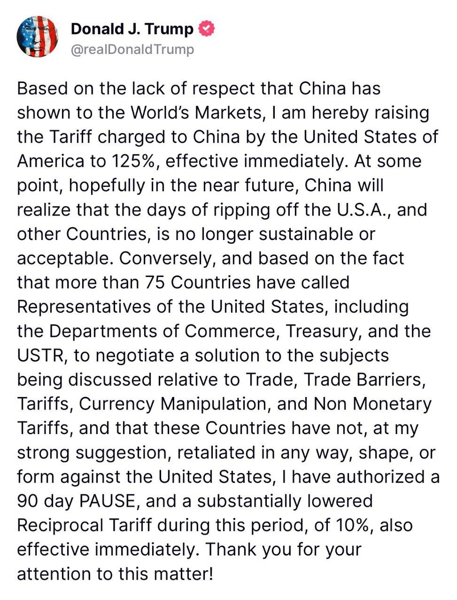 90-day PAUSE on ALL other tariffs, lowers reciprocal tariffs to 10%