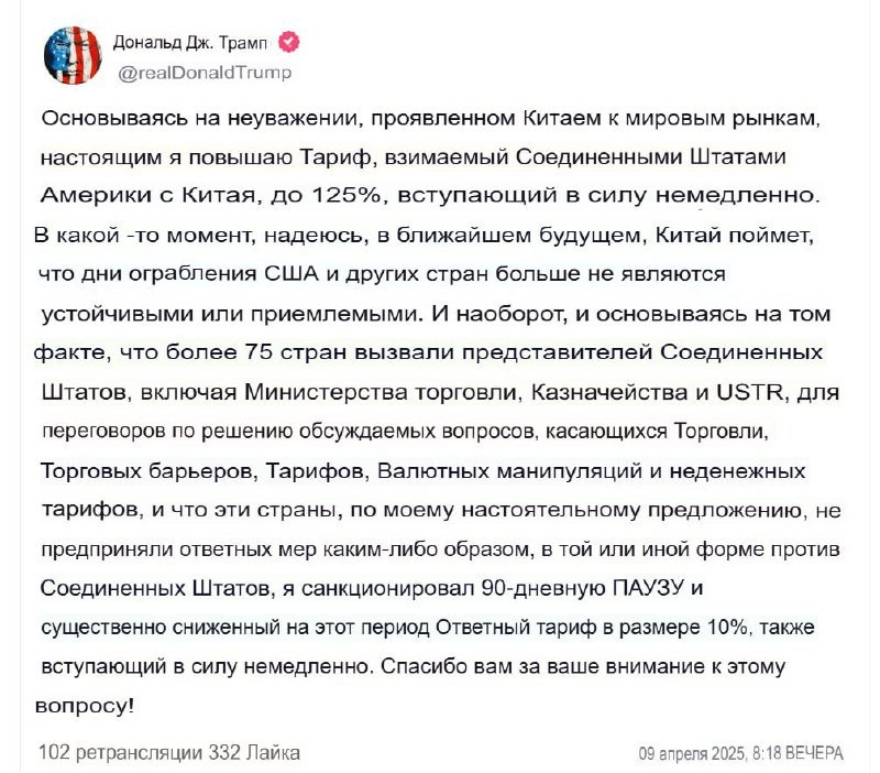 ⚡️ Трамп вводит пошлины в 1️⃣2️⃣5️⃣% против Китая — всё из-за «неуважения к мировым рынкам