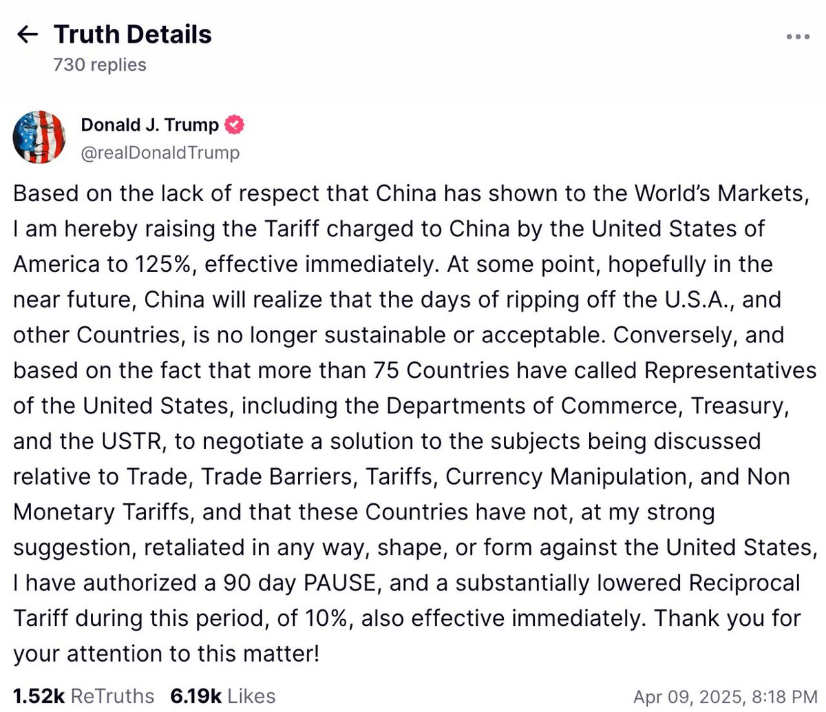 Трамп заморозил введение таможенных пошлин на 90 дней! Это касается всех стран кроме Китая. Китай наоборот получил 125% вместо 104%....