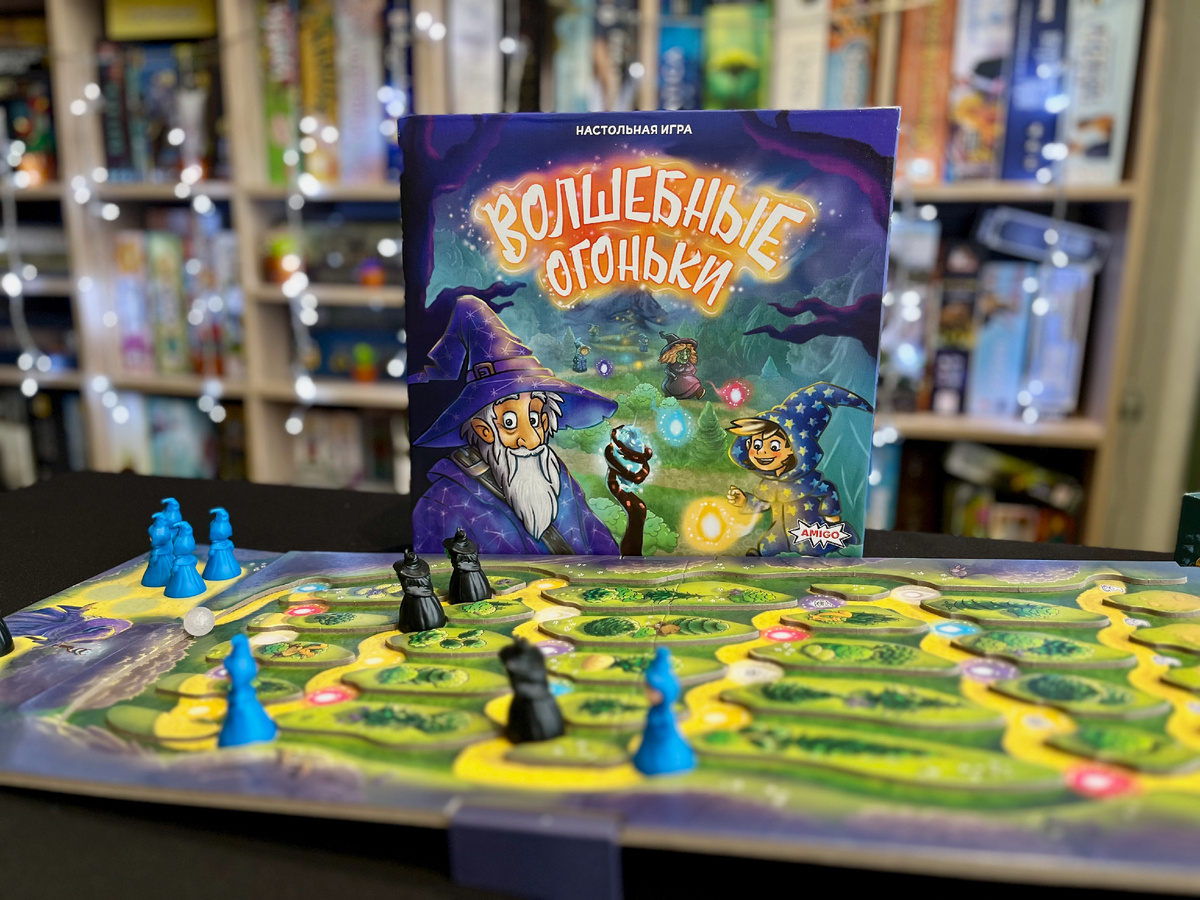 «Волшебные огоньки» – это тот вид детских игр, от которых трудно оторваться даже взрослому: невероятно привлекательная да ещё азартная. В начале партии при помощи специальных пластиковых держателей вы превращаете игровое поле в склон, по которому будут двигаться фигурки и шары. Вся игра завязана одновременно на расчёте, удаче и скорости реакции. Ваша задача – довести учеников до волшебника, прежде чем до него доберутся ведьмы. Для этого каждый ход вы вытягиваете из мешочка шарик (всего их 5, каждый уникального цвета) и бросаете в один из шести желобков. Шарик катится по пути, который постоянно разветвляется, и есть несколько вариантов развития событий. Если шарик ударяется в фигурку, то она перескакивает на следующее место, обозначенное тем же цветом, что и шарик. Поскольку ведьма – тоже фигурка, то она так же продвигается вниз, всё ближе и ближе подбираясь к волшебнику. Когда вы убираете фигурку, в которую упёрся шарик, он продолжает катиться вниз, и бывают такие классные моменты, ког
