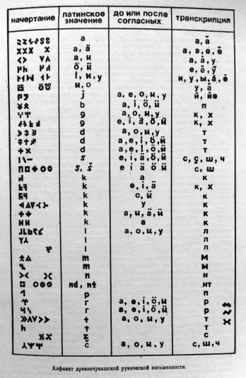 Чувашский национальный алфавит имеет следующие характеристики: написание справа налево, иногда сверху вниз. Присутствие начального гласного, возможное отсутствие среднего гласного. Начертание имелось угловатое, а также овально форменное. Основываясь на неимение государственности в последующие века, разнообразности материала (пр.: металлические украшения, одежда, могильные столбы, деревянные элементы), наличии различных данных в фольклоре, подтверждает мнение о массовом распространение данной письменности вплоть до XVIII века. Что является единичным случаем относительно других народов.