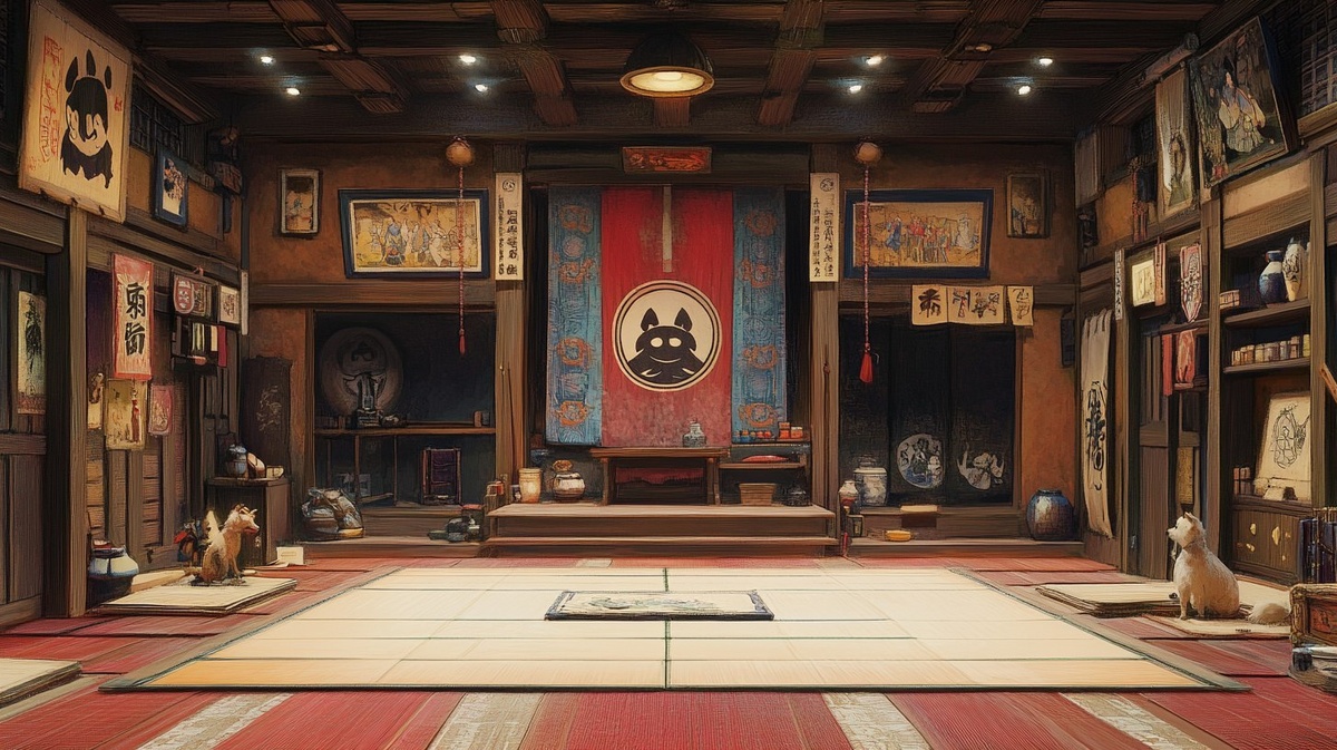 Создано на основе запроса: an interior of a studio ghibli cartoon inspired samurai dojo with dog theme and with tatami on floor and a