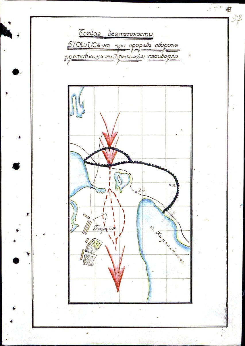 а) ликвидировать передовую позицию на Тарханском направлении, и к утру 9.04.44г. выйти на рубеж 3,9, южный берег безым. озера (4 км сев. Тархан) кург. 11.6
