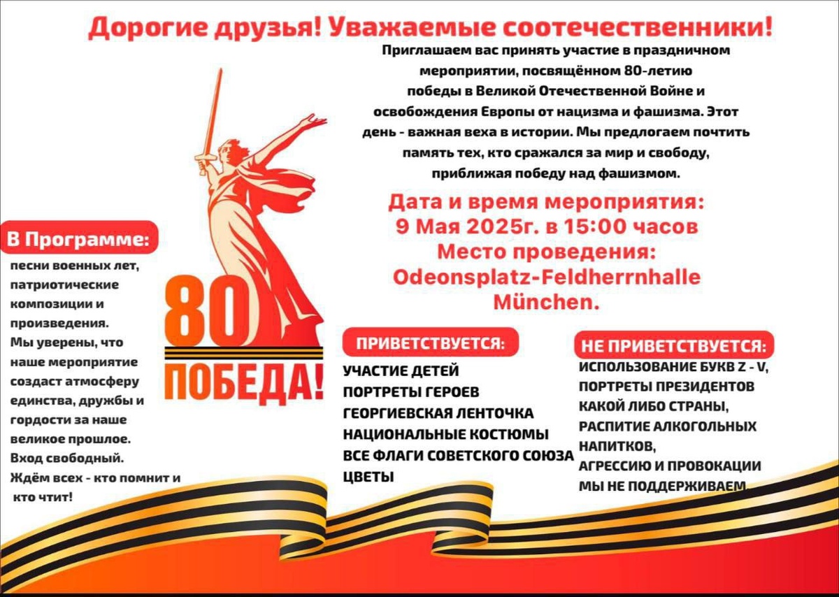 Уважаемые соотечественники! Приглашаем всех, кому дорога память о героях-победителях во Вторй Мировой Войне 1939-1945 годов принять участие в праздничном мероприятии посвященному 80-летию Победы. 09.05.2025, 15:00. Odeonsplatz-Feldherrnhalle, München Новости проекта: https://munchen-vesti.de/events/9mai #80-летие_Победы #Мюнхен #Бессмертный_Полк_Германия Русскоговорящая Германия @germanija