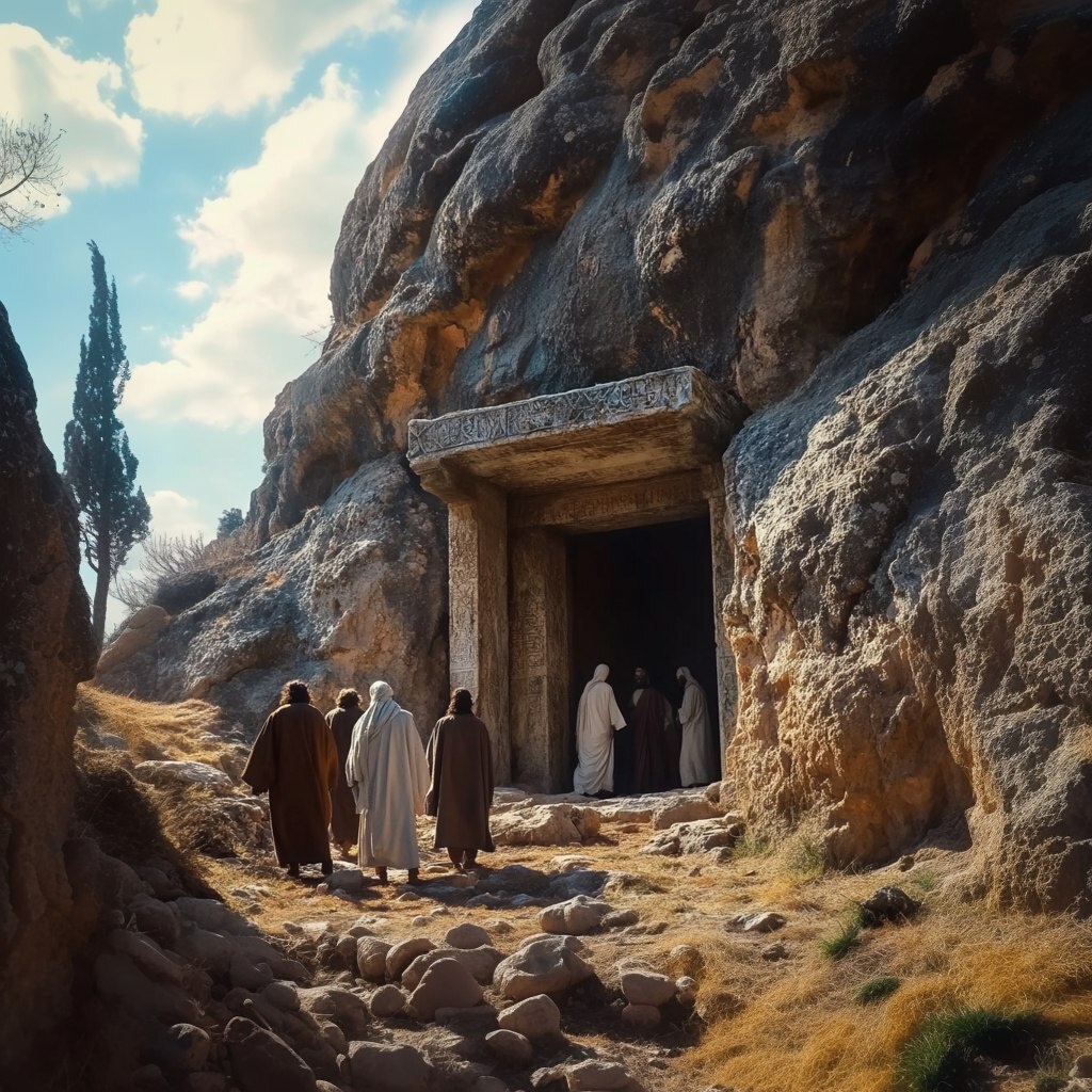 Создано на основе запроса: A cinematic photograph of the tomb where Jesus was buried, with his disciples standing outside and an open stone