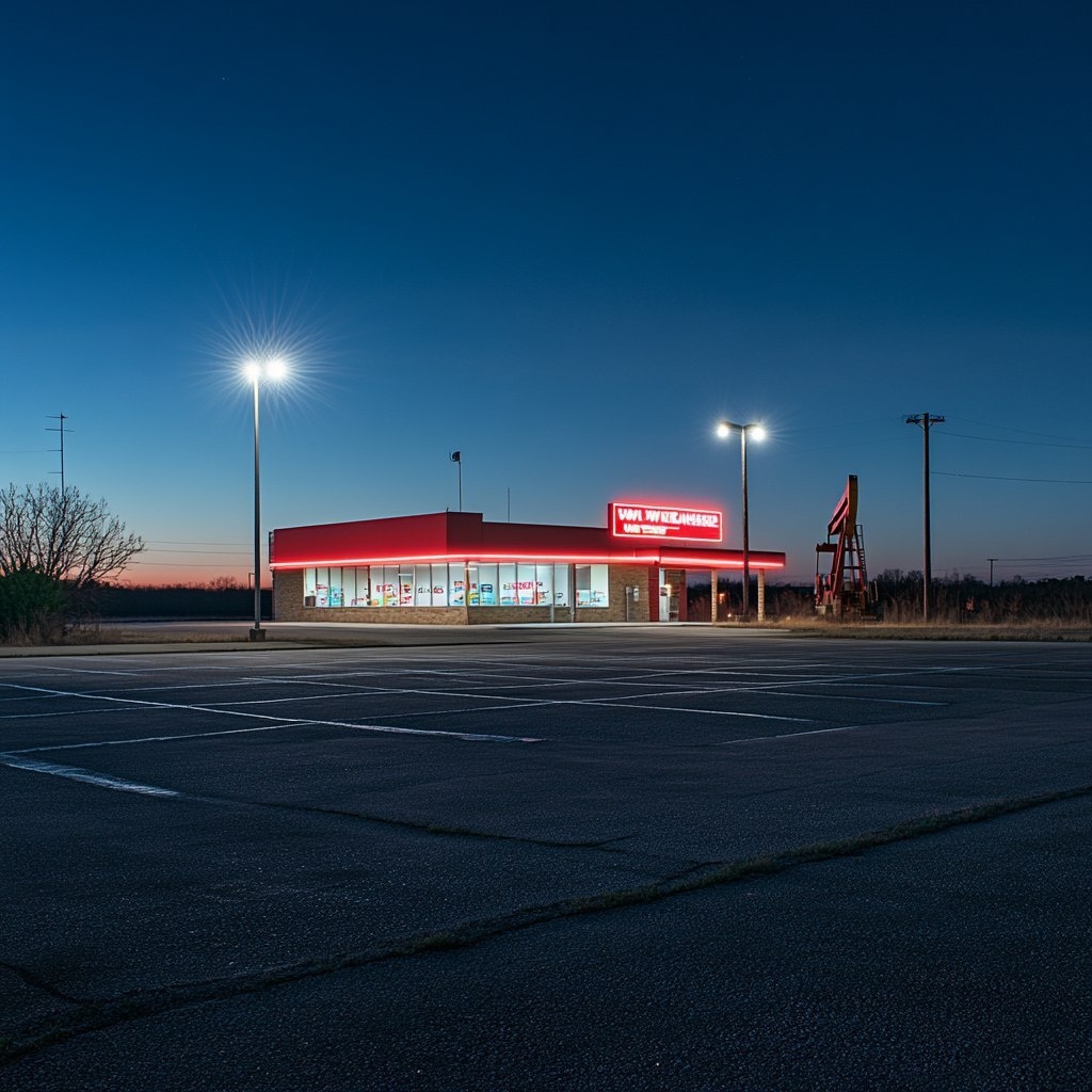 Создано на основе запроса: a boxy Walgreen's style pharmacy with neon sign with several lightposts lighting a large empty parking lot with white parking lines, set in the east texas brushland at night, with an oil pumper in the far background. gritty. dramatic 16:9 --- Автоперевод: Квадратная аптека в стиле Walgreen с неоновой вывеской с несколькими световыми лапостами, освещающими большую пустую парковку с белыми парковочными линиями, установленные в восточном Техасе Brushland ночью, с масляным насосом на дальнем фоне. Как тебе эта картинка? 🤔 https://dzen.ru/id/65c0c65c86e4f837c27b24d7 #ИИ #AI #нейросеть #midjourney #art