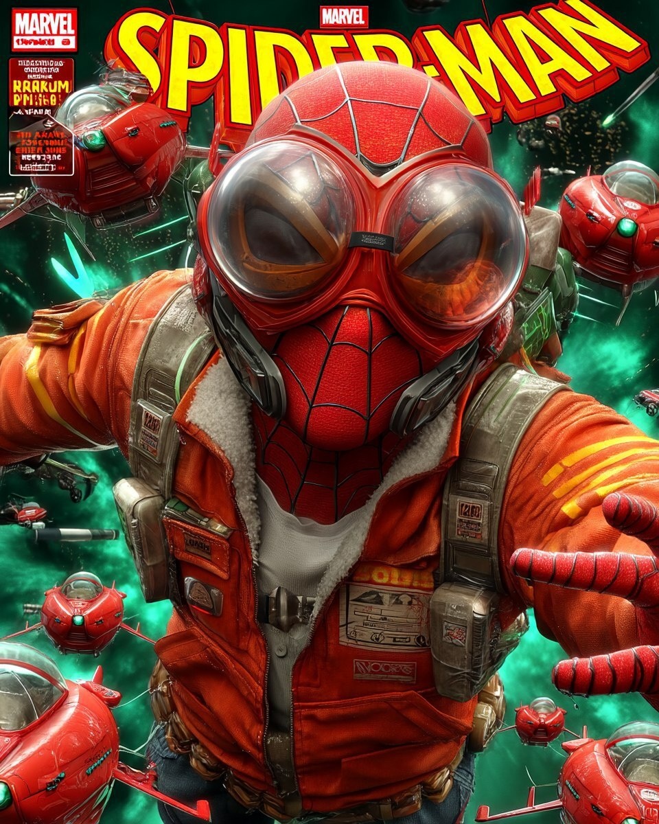 Создано на основе запроса: 80s MARVEL comic book cover. Spiderman surrounded by spaceships, action scene --- Автоперевод: Обложка комиксов Marvel 80 -х. Интересно выглядит? 🤔 https://dzen.ru/id/65c0c65c86e4f837c27b24d7 #ИИ #AI #нейросеть #midjourney #art