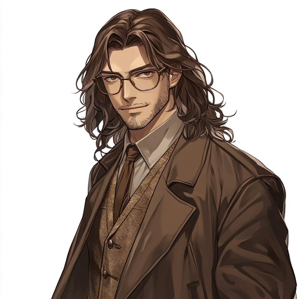 Создано на основе запроса: A tall, middle-aged man with long, shoulder-length brown hair Wearing rectangular glasses, An aristocratic outfit