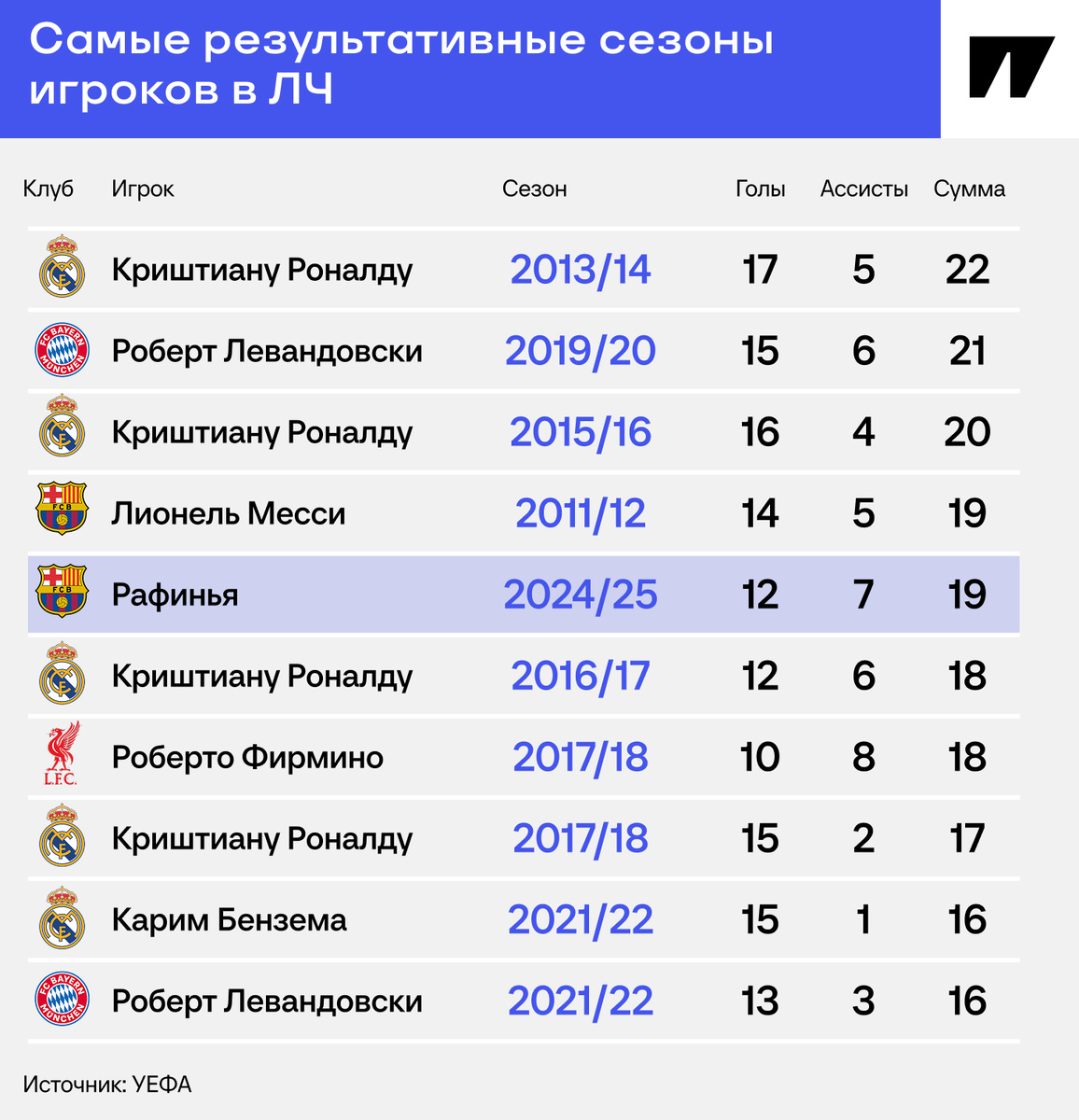 Лучший из бразильцев. Рафинью не остановить в этом сезоне. Теперь разорвал «Дортмунд» голом с сантиметра и двумя ассистами. Бразилец – среди лучших за всю историю Лиги чемпионов. Только что ворвался в топ-5. ⭐️ Рафинья теперь лидер среди среди бразильцев: ни у кого не было 19 результативных действий. Вингер «Барсы» обошел Кака из «Милана» (13 в сезоне-2006/07) давно, а Роберто Фирмино из «Ливерпуля» с 18 созданными мячами в ЛЧ-2017/18 только что. ⭐️ Рафинья повторил рекорд Лео Месси в ЛЧ по голевым действиям за сезон. У бразильца 12 голов и семь ассистов в 11 матчах. Месси в монструозном сезоне-2011/12 оформил 14+5 – это лучший показатель в истории «Барселоны». У бразильца все шансы превзойти. ⭐️ Король ЛЧ – конечно, Криштиану Роналду. Португалец выдал рекордный сезон-2013/14: аж 17 голов и пять ассистов в «Реале». А затем еще трижды попал в список лучших, когда «Мадрид» забирал одну ЛЧ за другой. Но Рафинья способен обойти даже Криштиану: дальше еще ответный матч с «Дортмундом» и, ско