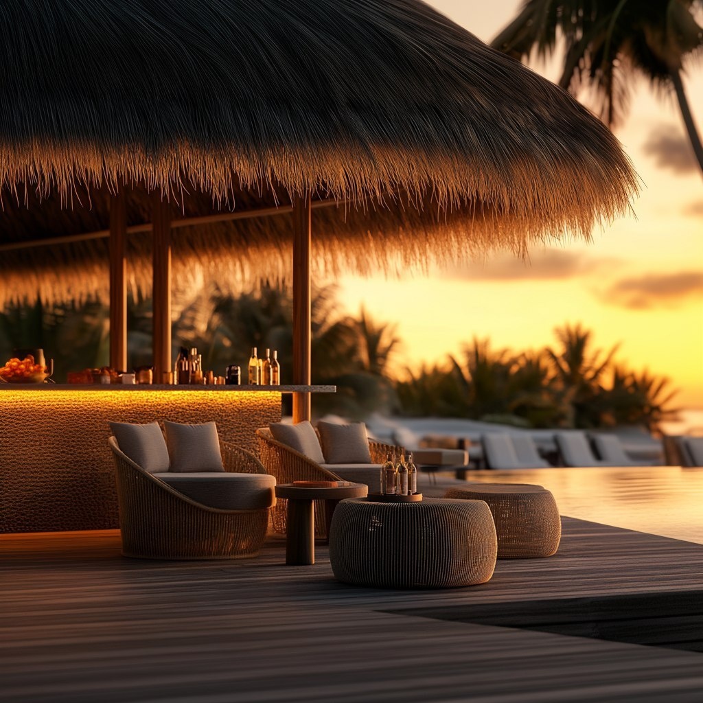 Создано на основе запроса: boho sunset resort with wicker materials and soft orange and pinl sky