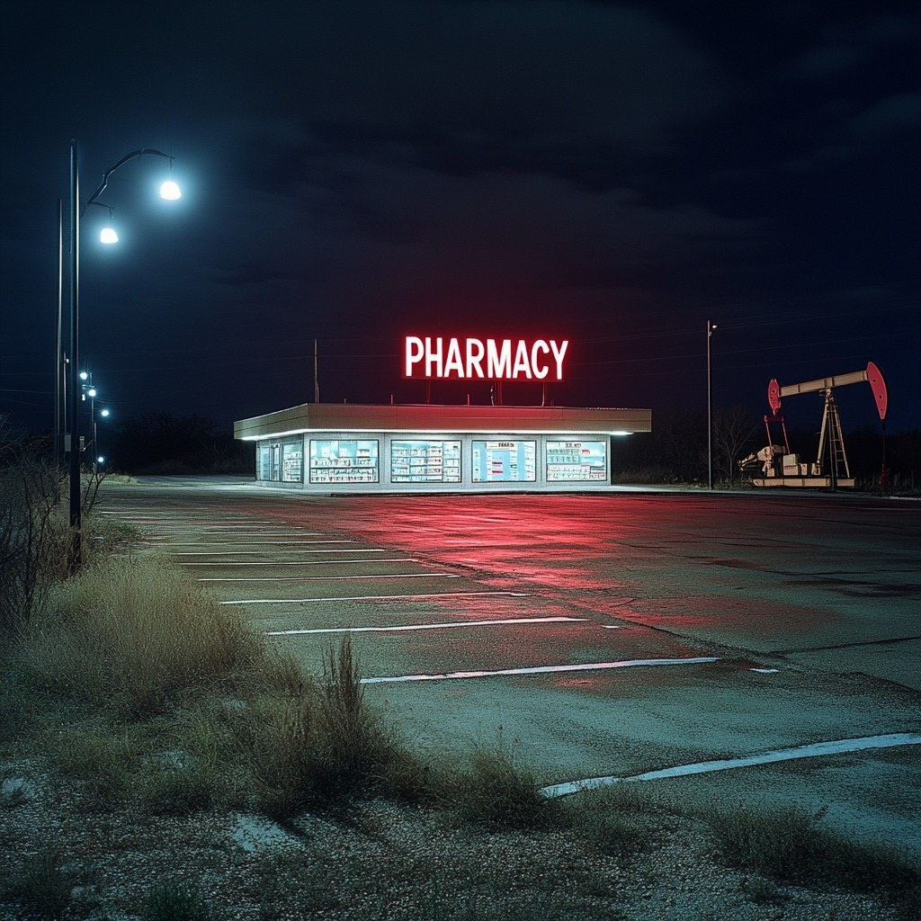 Создано на основе запроса: a boxy Walgreen's style pharmacy with neon sign reading "PHARMACY" with several lightposts lighting a large empty parking lot with white parking lines, set in the east texas brushland at night, with an oil pumper in the far background. gritty. dramatic 16:9 --- Автоперевод: Квадратная аптека в стиле Walgreen с чтением неоновой вывески «Аптека» с несколькими световыми платками, освещающими большую пустую парковку с белыми парковками, расположенными в восточном Техасе Brushland по ночам, с масляным насосом на дальнем фоне. Что скажешь? 🤔 https://dzen.ru/id/65c0c65c86e4f837c27b24d7 #ИИ #AI #нейросеть #midjourney #art