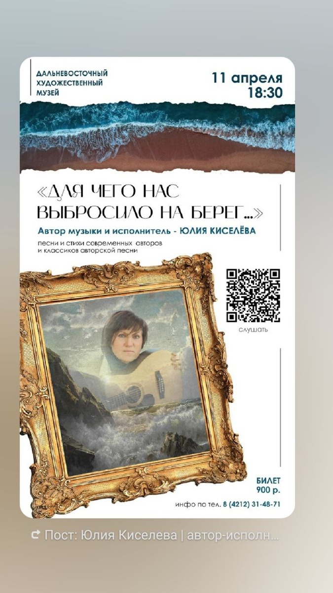 Уже завтра. "Для чего нас вообще выбросило на берег..." Фраза из стихотворения Маши Перцовой стала названием концерта. Поговорим о том, для чего же нас все -таки выбрала Жизнь; с чего и как получается ,что ты вдруг находишь ответ. И что дальше с этим делать☺️ В программе песни классиков, современная АП и стихи Б.Окуджавы, Е.Касьян, М.Перцовой, В.Мирошкина, К.Вихляева , А.Бабаджаняна 11 апреля/ пятн/ 18:30 Билеты в кассе музея и по ссылке https://dvhm.tn-cloud.ru/event/0EA397CA46F5F56EF906D1AEBDE97FC21706D617 #делисьхорошим