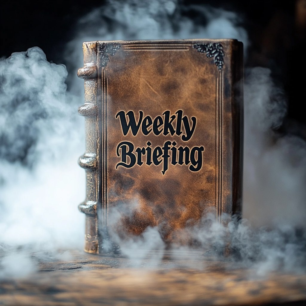 Создано на основе запроса: a leather bounded book with black letters "Weekly Briefing" on it with the background full of white mist in