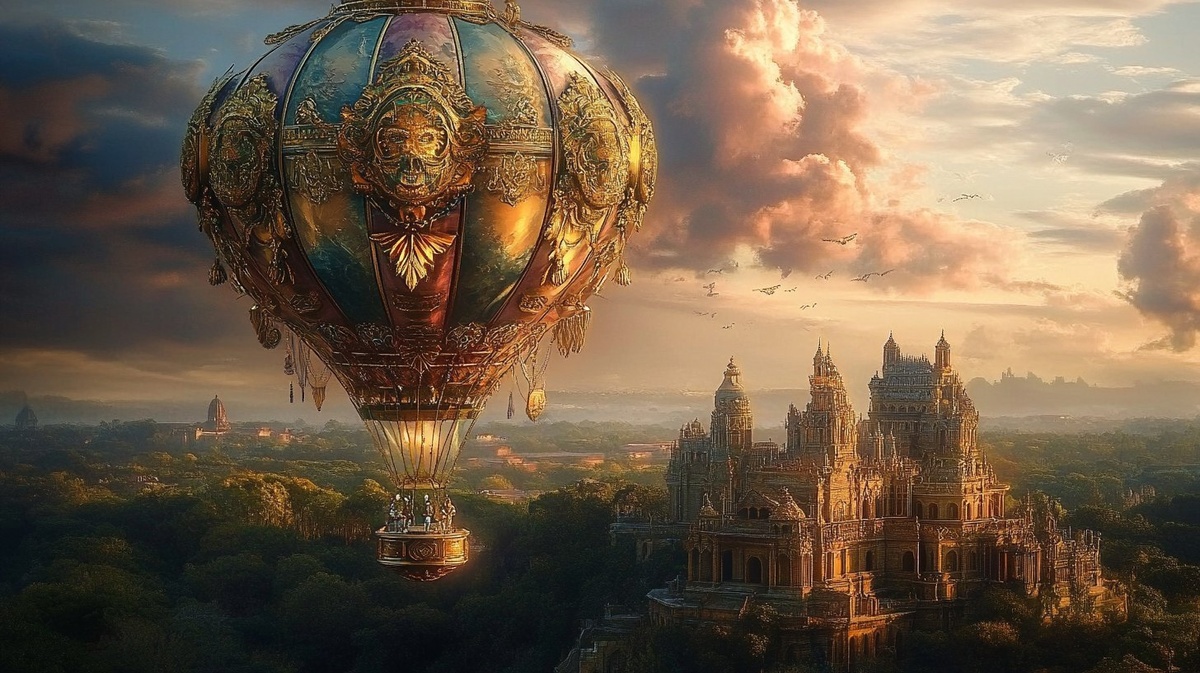 Создано на основе запроса: , , Matching this art style create a Fantasy landscape with an ornate hot air balloon that resembles these, set