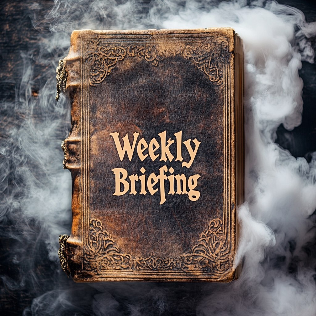 Создано на основе запроса: an ancient leather bounded book with the title "Weekly Briefing" written on it with the background full of white