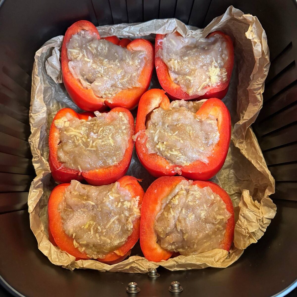 Решил с вами в быстром варианте поделиться рецептом, который готовлю частенько. Не будет видео, будут только фото до и после 🤣 Так как я не собирался снимать, а просто готовил❤️ Фаршированные ПП перцы На 6 порций нам понадобятся: 🐔 Грудка куриная либо фарш 450 гр 🐔 Сыр 60 гр 🐔 Соевый соус 30 гр 🐔 Лук 1 маленькая головка 🐔 Приправы по вкусу (я использовал паприку копченую, имбирь молотый, черный молотый перец) 🐔 Перец сладкий 3 шт Если у вас куриная грудка, то перебейте ее с луком в фарш. Сыр натрите на мелкой терке. Смешаете куриный фарш, сыр и приправы. Перцы разрежьте пополам и удалите сердцевину. Разложите подготовленную начинку в перцы. Готовьте в аэрогриле 25 мин при 170 градусах. Подавайте с любимым гарниром, овощами, зеленью или просто как самостоятельное блюдо❤️