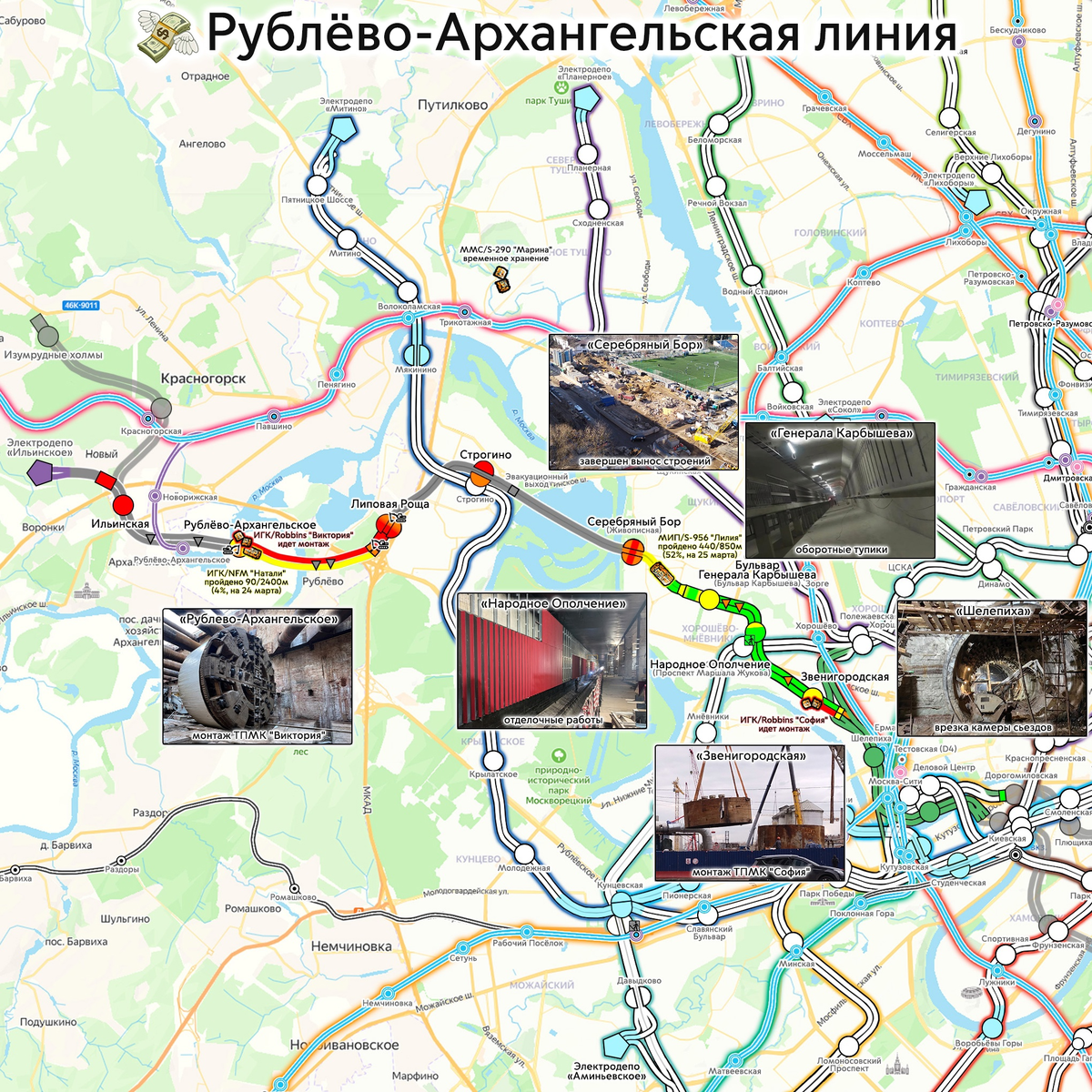 Мы продолжаем рассказывать о ходе строительства московского метрополитена. Нанесли на нашу схему развития метро все основные изменения за март 2025 года. Версия от 02.04.2025. 1) ⬅️Западный сектор, 💸Рублёво-Архангельская линия: - ⚒️ Продолжаются горнопроходческие работы по врезке камеры съездов в тоннель бывшего перегона от «Шелепихи» до «Хорошевской». - 🏗️ На «Звенигородской» приступили к монтажу ТПМК "София". Напоминаем, щиту предстоит пройти часть второго тоннеля до «Шелепихи». - 👷♂️ На «Народном Ополчении» приступили к отделке путевых стен. - ✅️ На «Бульваре Генерала Карбышева» готовы конструкции оборотных тупиков. - ⚙️ Обновлены данные по проходке двухпутного тоннеля перегона️ «Бульвар Генерала Карбышева» - «Серебряный Бор». По состоянию на конец месяца, ТПМК "Лилия" пройдено 440 из 850 метров (52%). - ✅ Завершён демонтаж строений, препятствующих строительству станции «Серебряный Бор». - 🚜 Продолжается раскрытие в торцах котлована станционного комплекса «Липовая Роща» (монтаж