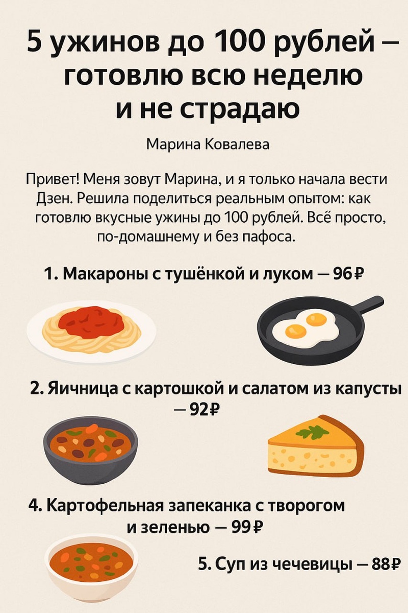 Автор: Марина Ковалева Привет! Меня зовут Марина, и я только-только начала вести Дзен. Решила поделиться своим реальным опытом: как я кормлю семью вкусно, быстро и до 100 рублей за ужин. Без изысков, но с душой. 💡 Все цены — по Воронежу, покупаю в "Пятёрочке" и "Магните", беру по акциям, считаю на 2–3 порции. Если интересно — могу выложить рецепты по шагам, с фото. А ты пробовал(-а) готовить на 100 рублей? Поделись в комментариях! 💬