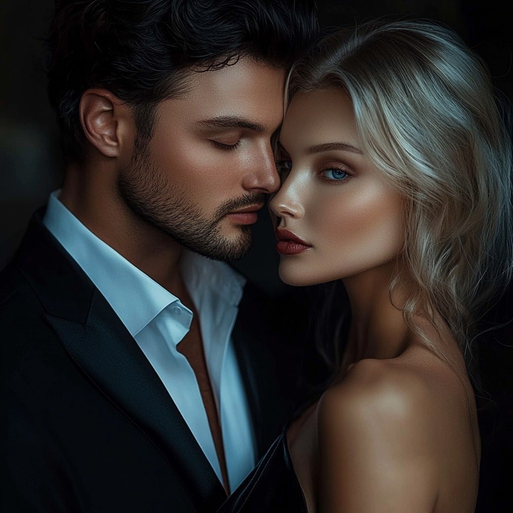 Создано на основе запроса: romantic and stunning couple in an intimate moment. The man, 35, has very dark hair, a stubble of beard, and piercing blue eyes. He wears a tailored black suit with a crisp white shirt. The woman, 28, has blond hair, striking blue eyes, and an elegant black silk dress with delicate spaghetti straps resting on her shoulders. They kiss passionately. The background is dark and shadowy, with soft cinematic lighting that enhances the depth and romance of the scene. The atmosphere is luxurious, ultra-realistic, and highly detailed. --- Автоперевод: Романтическая и потрясающая пара в интимный момент. Необычно выглядит? 🤔 https://dzen.ru/id/65c0c65c86e4f837c27b24d7 #ИИ #AI #нейросеть #midjourney #art