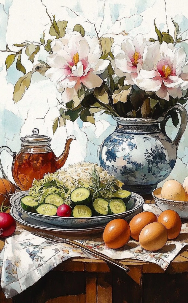 Продолжаю свои диетические зарисовки на терапии семаглутидом. Разнообразие — это не про нас. Питание сводится к небольшому набору продуктов. Голова свободна от постоянного построения планов съесть что-то. Я пока только учусь распоряжаться этим свободным временем, хоть и уже скоро год как колю семаглутиды. Завтра у меня будет 2 мг Квинсенты из оставшейся ручки. Пока купить новую Велгию не получается, но есть чем заменить, так что всё ок. Ботом посчитаю мг в щелчках. #ai #midjourney #диетавкартинках #тарелочки #rusolga