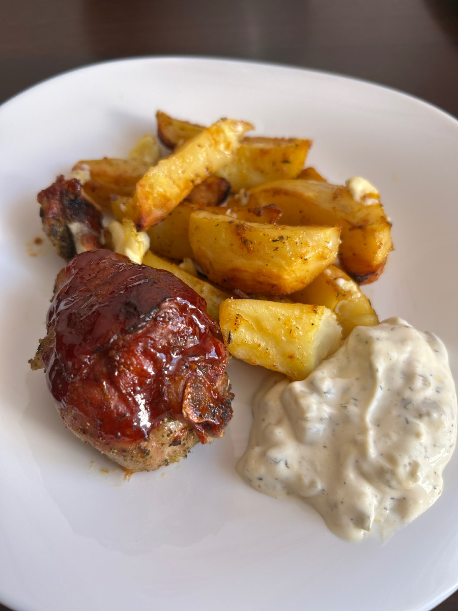 Это новый для меня рецепт , но он оказался очень вкусный, оценила вся семья , подойдет и под праздничное блюдо. 🔥 Куриные ножки в беконе с медово-барбекю глазурью Хрустящие, липкие, сладко-пряные — идеальный вариант для пикника или футбола! 🛒 Ингредиенты (на 6 порций): ✔ Куриные ножки — 12 шт (голень+бедро) ✔ Бекон — 12 полосок ✔ Мёд — 3 ст.л. ✔ Соус барбекю — 5 ст.л. ✔ Горчица — 1 ст.л. ✔ Чеснок — 3 зубчика ✔ Паприка копчёная — 1 ч.л. ✔ Соль/перец — по вкусу 👨🍳 Пошаговый рецепт 1. Подготовка (10 мин) 1. Ножки промокните салфеткой, посолите, поперчите, обваляйте в паприке 2. Каждую ножку плотно оберните беконом (как спиралью) 2. Глазурь (3 мин) Смешайте в миске: - мёд - соус барбекю - давленый чеснок - горчицу 3. Запекание (50 мин) 1. Разогрейте духовку до 190°C 2. Выложите ножки на решётку (противень застелите фольгой) 3. Смажьте половиной глазури 4. Выпекайте 30 минут → переверните → смажьте оставшейся глазурью 5. Готовьте ещё 15-20 мин до карамельной ко