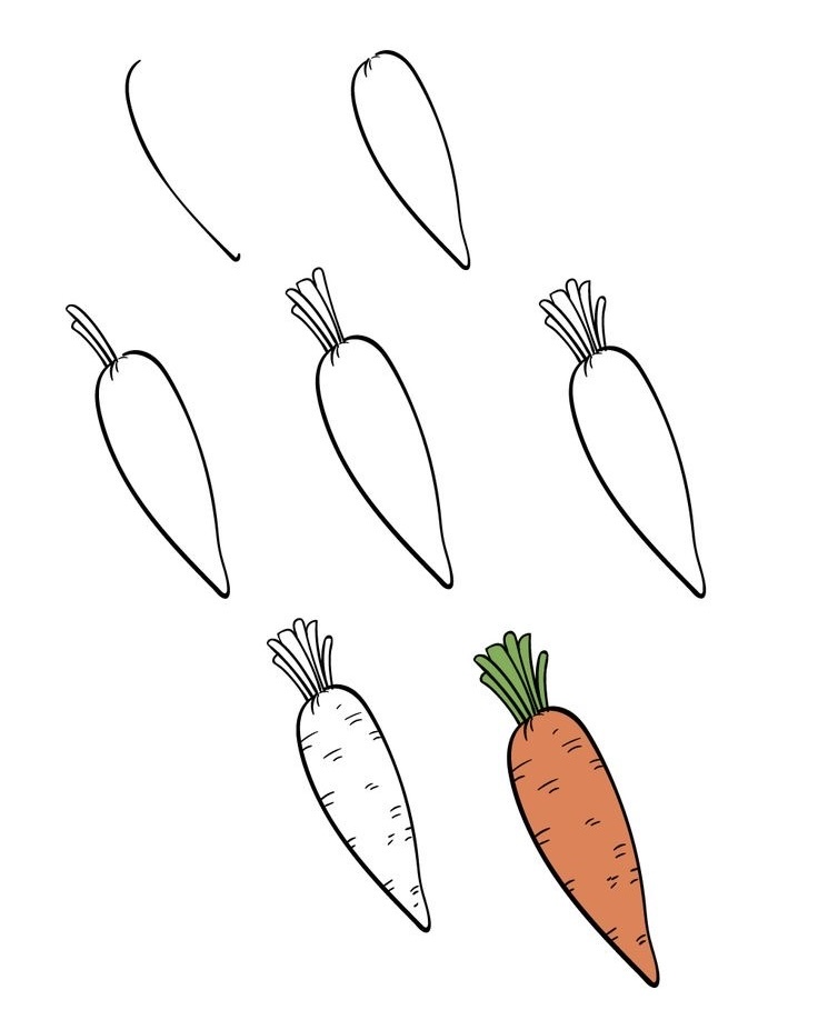 Отлично, вот простой и быстрый способ нарисовать морковку за 5 минут! Материалы: • Бумага • Карандаш (обычный или цветной) • Ластик (мягкий) • Цветные карандаши, фломастеры или краски (оранжевый, светло-оранжевый, зеленый) Шаг 1: Основная форма 1. Нарисуйте вытянутый треугольник с закругленными углами. Это будет основная форма морковки. Не нажимайте сильно на карандаш, чтобы потом легко стереть линии. Шаг 2: Хвостик 1. В верхней части треугольника (широкая часть) нарисуйте несколько неровных линий, чтобы изобразить ботву. Это должны быть тонкие, слегка изогнутые линии, расходящиеся в разные стороны. Можно сразу добавить несколько листиков, это ускорит процесс. Шаг 3: Детали 1. Добавьте небольшие неровности по бокам морковки, чтобы сделать ее более реалистичной. 2. Нарисуйте несколько тонких горизонтальных линий, чтобы показать текстуру морковки. Не делайте их слишком ровными. Шаг 4: Цвет 1. Раскрасьте морковку оранжевым цветом. Используйте более светлый оттенок оранжевого дл