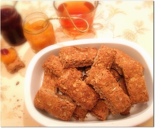 Рецепт очень простой и быстрый. И вкус просто замечательный! - 100 г. овсяной муки - 50 г. пшеничной муки - 50 г. муки грубого помола (цельнозерновой) - 170 г. овсяных хлопьев (тех, что малой варки) - 4 ст.л. сахара (или мёда) - 2 ч.л. разрыхлителя - щепотка соли - 1-2 ч.л. корицы - 1/3 ч.л. мускатного ореха - 1/3 ч.л. кардамона - 1/2 ч.л. молотого имбиря - горсть орехов, семечек, сушёных ягод и т.д. (у меня был пакетик очищенных семечек 100г.) - 1 яйцо - 100 г. сливочного масла - 75 мл. молока Включить духовку на 200С. Сливочное масло растопить удобным способом и оставить на столе охлаждаться. В миску положить все виды муки, обжаренные на сухой сковороде овсяные хлопья, обжаренные семечки/дроблёные орехи, разрыхлитель, пряности, соль, сахар или мёд. Яйцо взболтать в отдельной миске и влить в миску к сухим ингредиентам, туда же влить растопленное масло и молоко, всё тщательно перемешать. Противень застелить пекарской бумагой и выложить на бумагу готовое тесто, разровнять руками или рас