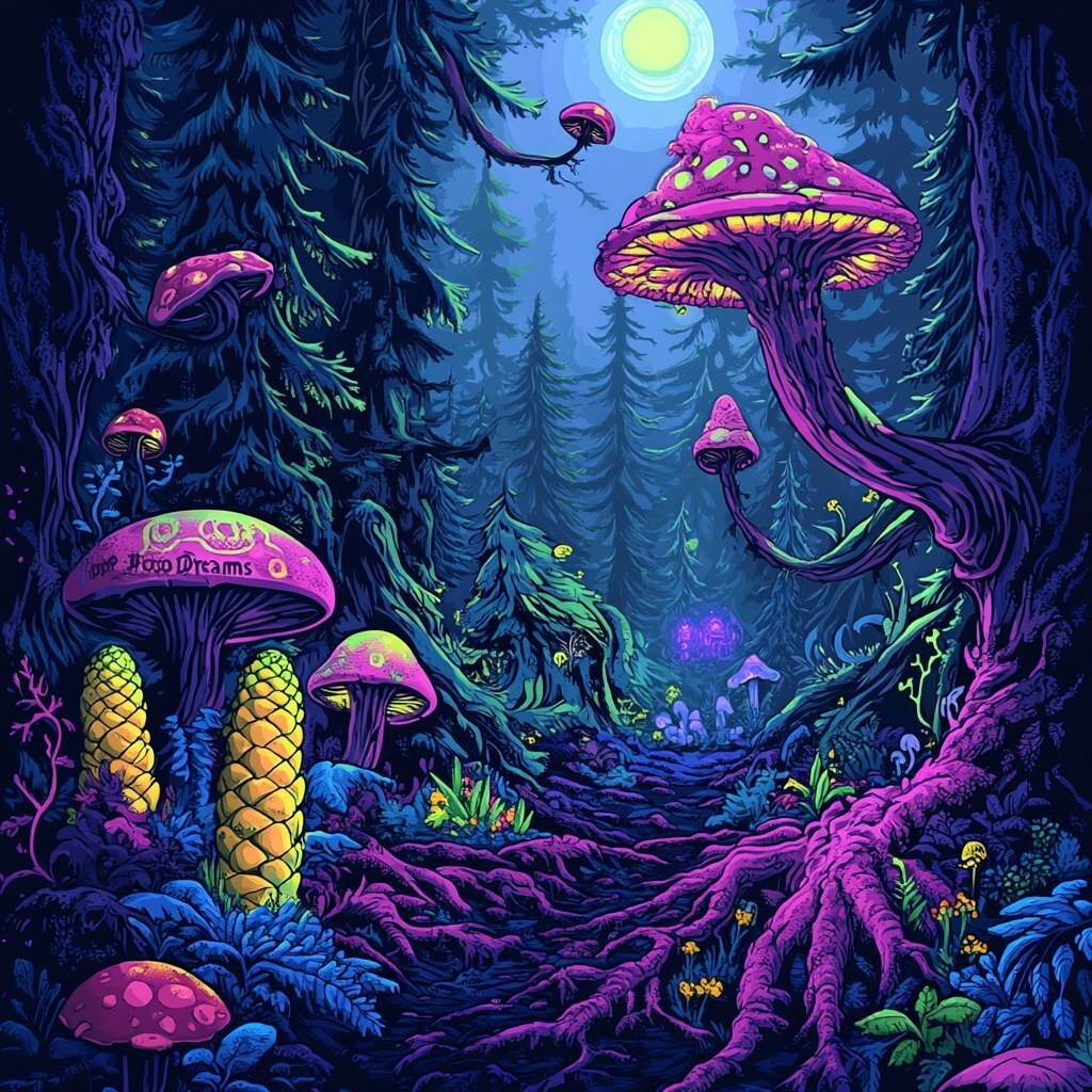Автоперевод: Сюрреалистический психоделический лес, вдохновленный «Dreams Hopwood Dreams», светящимися соснами, плавающими негабаритными конусами хмеля, неоновым туманом и туманом цитрусового, скрученными корнями и фрактальными узорами, яркими грибами и инопланетными флорами, глубоко цветовой контрастность