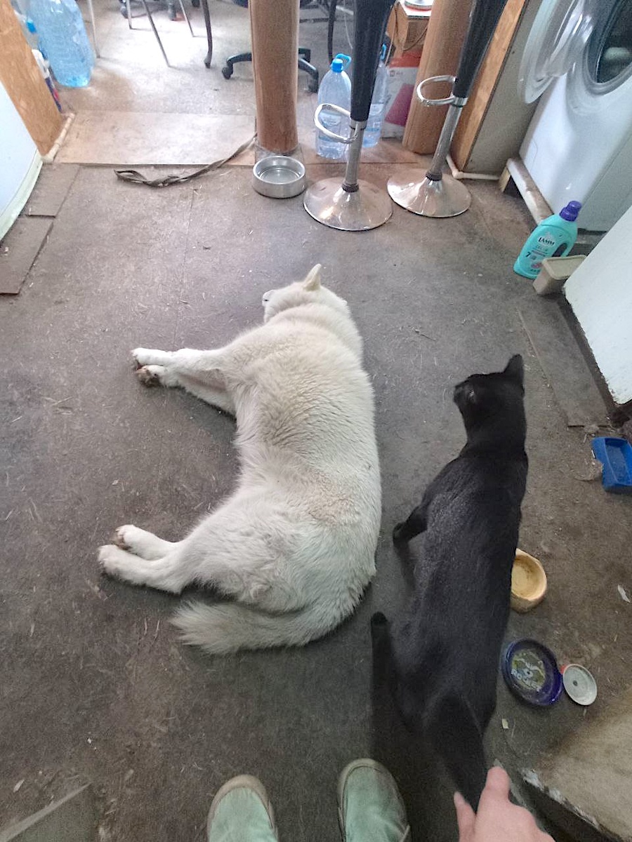 Упражнение или игры с животными можно сделать буквально из ничего. Так, например, Лимон очень боится проходить мимо собак. Однако предпочитает проводить время со мной - настолько, что в какой-то момент отважился пройтись по самому краешку стола, где у нас сушится посуда, стоят специи и плита, лишь бы добраться до меня (нашел «обходной путь» мимо собак, лежащих на кухне). И вроде бы можно его было за это поругать (у нас кошкам запрещено ходить по столам - по крайней мере тогда, когда мы видим это), но ведь у него была такая благородная цель! И кот, чтобы достичь ее, проявил чудеса храбрости и недюжинную смекалку! И даже к волшебнику страны Оз за этим не ходил – все сам, все сам. К тому же зачем ругать, если можно переучить? Да так, чтобы и зверю было комфортно, и меня устраивало. И начали мы с Лимоном стали ходить мимо спящего Снежка. Я иду мимо него, чаузи рядом со мной, у ноги, как заправский служебный пес, но так, чтобы между ним и собакой была я. Прошли в одну сторону – я хвалю, гла