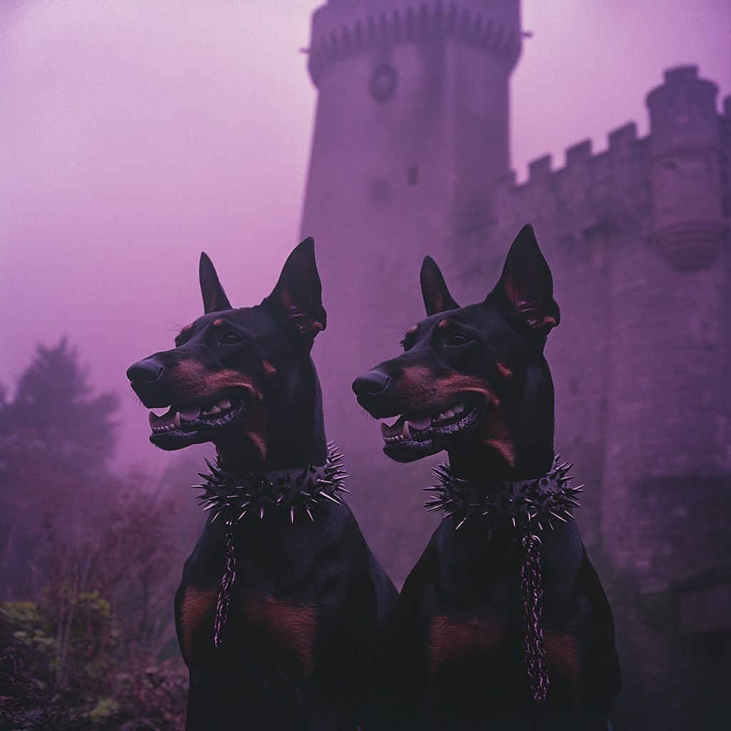 Создано на основе запроса: film photo of doberman dogs with spikey accessories in front of an ancient castle surrounded by purple mist, dogs