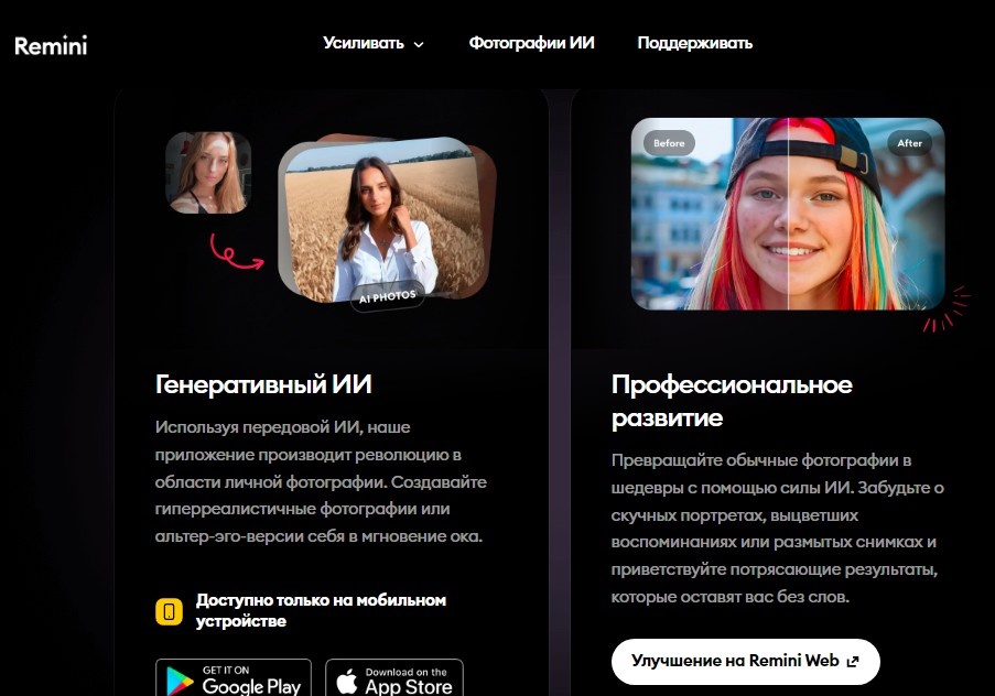 Remini.ai — это онлайн-платформа и мобильное приложение, использующее искусственный интеллект для улучшения и трансформации изображений. Сервис ориентирован как на профессионалов (фотографов, дизайнеров), так и на обычных пользователей, желающих быстро обработать фото. Интерфейс с минималистичным дизайном и интуитивным управлением. Загрузка фото занимает секунды, а инструменты сгруппированы по категориям. Работает в браузере и мобильных приложениях (iOS, Android). Генерация видео, изображений, создание аваторок возможны лишь в мобильной версии. Доступен предпросмотр до и после обработки в реальном времени. Рассмотрим браузерную версию. Масштабируйте любое изображение до более высокого разрешения, делая его более четким и детализированным. Ваши изображения останутся четкими и без дефектов. С Remini вы устраните нежелательную зернистость и создадите высококачественные фотографии. Remini избавит от размытости движения и вернет нечетким фотографиям сверхчеткое совершенство. Благодаря функ