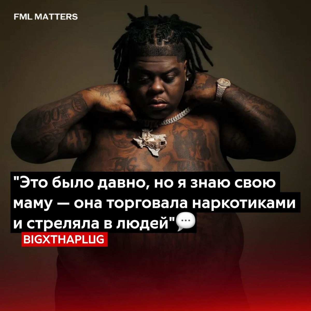 🔫 МАТЬ BIGXTHAPLUG БЫЛА ГАНГСТЕРОМ! В новом интервью для GQ техасский рэпер вспомнил случай из своей жизни, когда он стал свидетелем того, как его мать выстрелила в грабителя, пока он смотрел «Скуби-Ду». «Впервые я увидел, как кого-то застрелили, когда мама держала меня на руках. Моя мама застрелила человека — они пытались проникнуть в дом. Я сидел на диване и смотрел «Скуби-Ду», я никогда этого не забуду», — рассказал BigX 💀 FML MATTERS