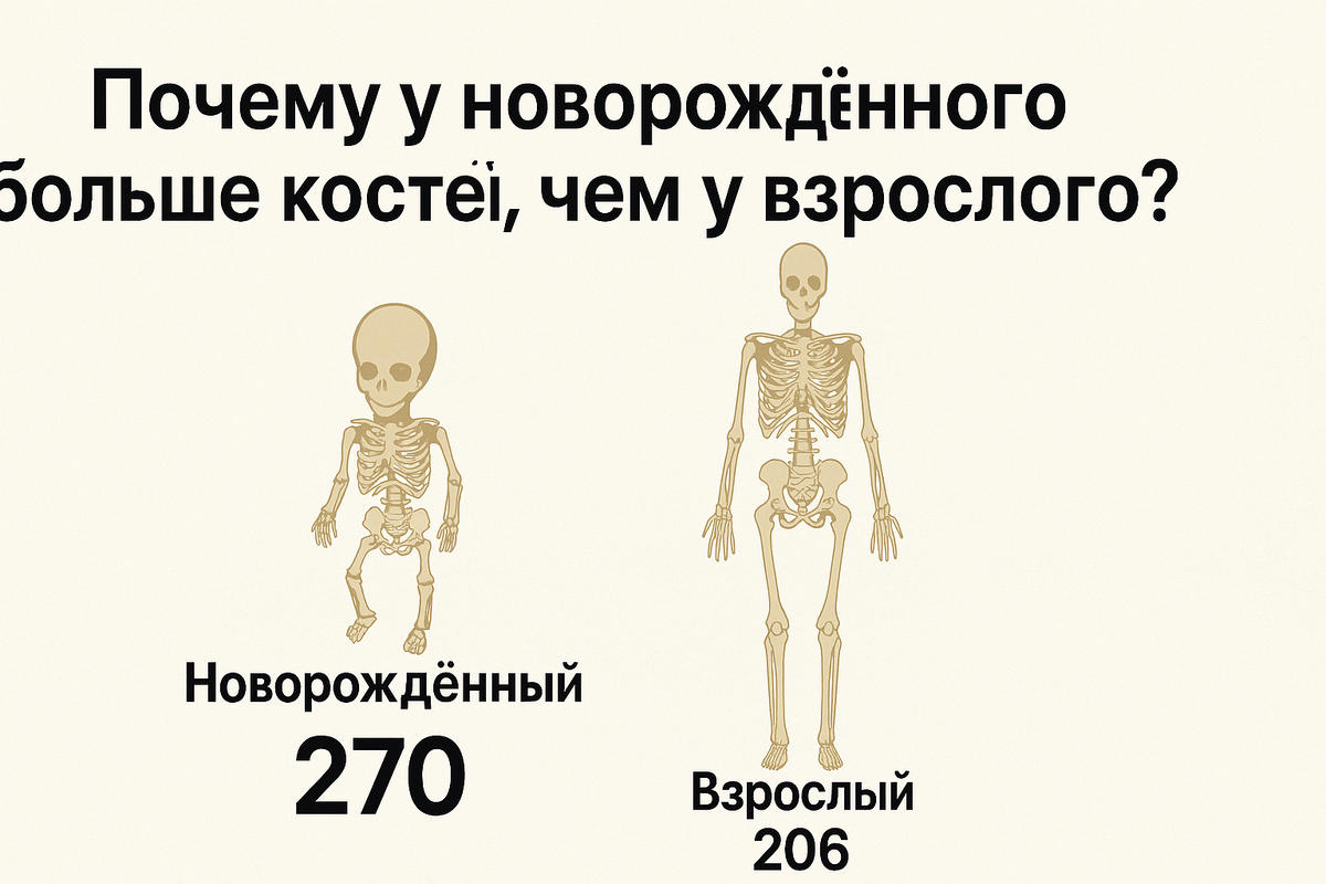Когда вы держите на руках новорождённого, он кажется хрупким и маленьким. Но знаете ли вы, что у него в теле примерно на 64 кости больше, чем у взрослого человека? Да-да, у младенца около 270 костей, а у взрослого — всего 206. Как такое возможно? Куда деваются "лишние" кости по мере взросления? Разберёмся, что стоит за этой удивительной цифрой и зачем природа так всё устроила. На самом деле кости не исчезают — они срастаются. У новорождённого скелет ещё не полностью сформирован: многие его кости состоят из отдельных фрагментов, соединённых хрящами. Это даёт телу гибкость и пластичность, которые просто необходимы в начале жизни. Большинство «дополнительных» костей у младенца — это хрящи, которые постепенно становятся костной тканью. Этот процесс называется оссификация и продолжается вплоть до 20–25 лет. Вот несколько ориентиров: Интересно, что в первые годы жизни кости ребёнка чрезвычайно гибкие. Это делает малышей почти «резиновыми» — они могут легко заворачиваться в позы, которые взро