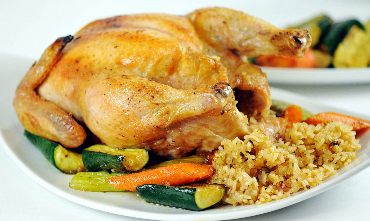 - Общее время запекания – около 1,5 часов (из расчета 45 минут на каждый килограмм веса). Для курицы весом 2 кг – примерно 1 час 30 минут.