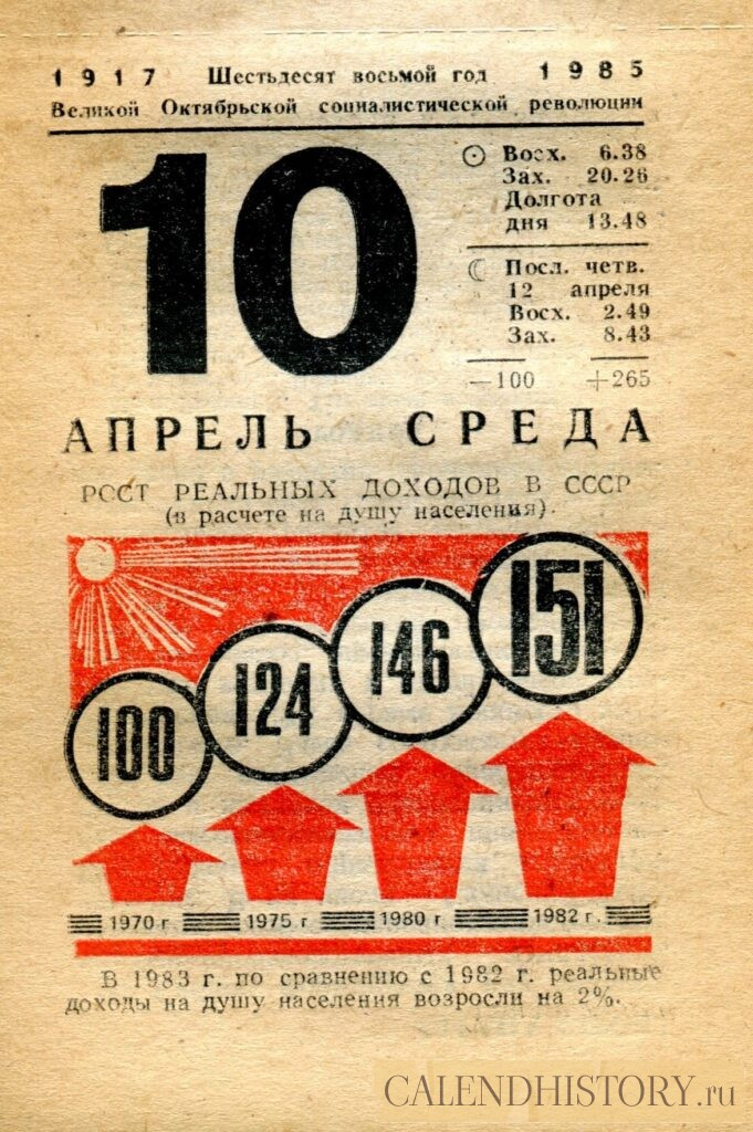 Итак, сегодня 10-го апреля и у нас на календаре 1985-й год. Перед нами листок советского календаря для женщин.