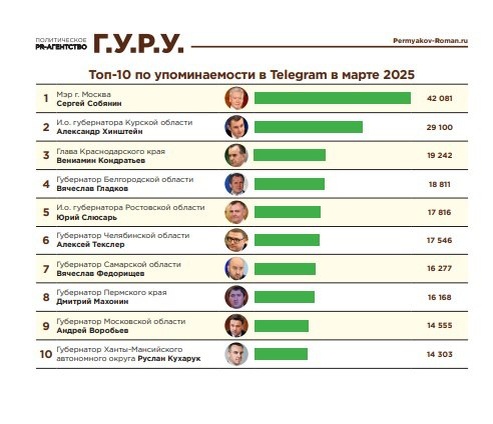 💪В топ самых медийных губернаторов вошел Кухарук Глава Югры занял 10-ю строчку рейтинга аналитического центра «Г.У.Р.У» по итогам марта. На упоминаемость Кухарука, по мнению экспертов, повлиял «Кубок защитников Югры», фестиваль «Дух огня» и рабочая встреча с Валентиной Матвиенко. 📸 Телеграм / Теле Стрим Подписаться | Прислать новость
