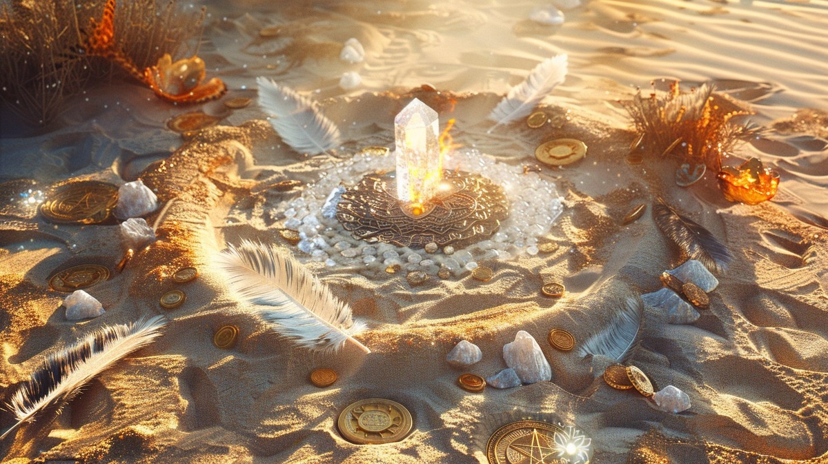 Создано на основе запроса: A ritual scene captured in the desert, circular sacred setup of crystals, gold coins, feathers, burning sage in center. Silk fabrics delicately layered on sand. Intense sunlight bathes everything in warm gold. High-detail realism with editorial styling. Created Using: Sony Alpha 1, desert HDR imaging, macro-sand texture realism, golden haze filters, abstract, luxury photo shoot composition, editorial spiritual props, lens distortion correction, hd quality, natural look
