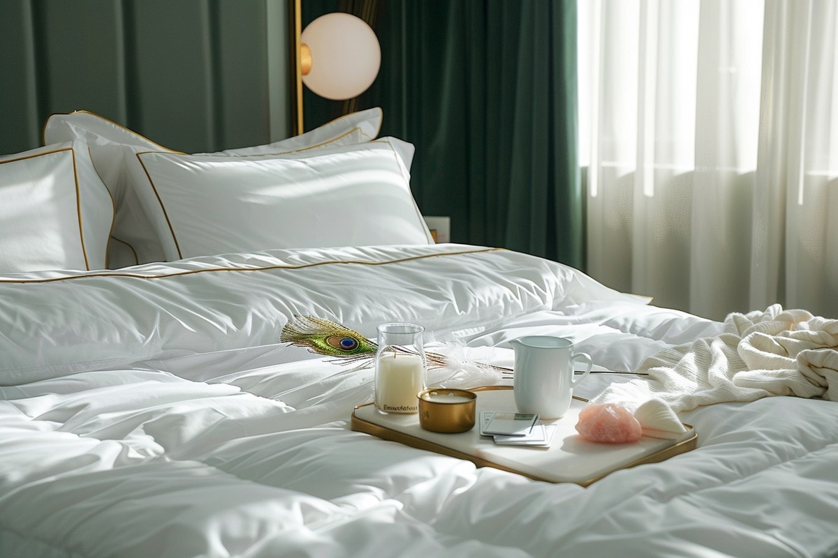 Создано на основе запроса: A photo-realistic luxury hotel bed, soft white linen with elegant gold-trim pillows, a minimal tray on the bed with rose quartz, a single candle, cup of tea, oracle cards, and a peacock feather. Soft morning light streaming in. Sacred feminine calm. Created Using: Canon EOS R5, natural softbox daylight, minimal styling, luxury bedding textures, shallow depth of field, sacred calm tone palette, editorial flat lay technique, hd quality, natural look --- Автоперевод: Фотореалистичный роскошный отель, мягкое белое белье с элегантными подушками из золотых трим, минимальный поднос на кровати с розовым кварцем, единственная свеча, чашка чая, карты Oracle и павлинское перьев. Как тебе такая картинка? 🤔 https://dzen.ru/id/65c0c65c86e4f837c27b24d7 #ИИ #AI #нейросеть #midjourney #art