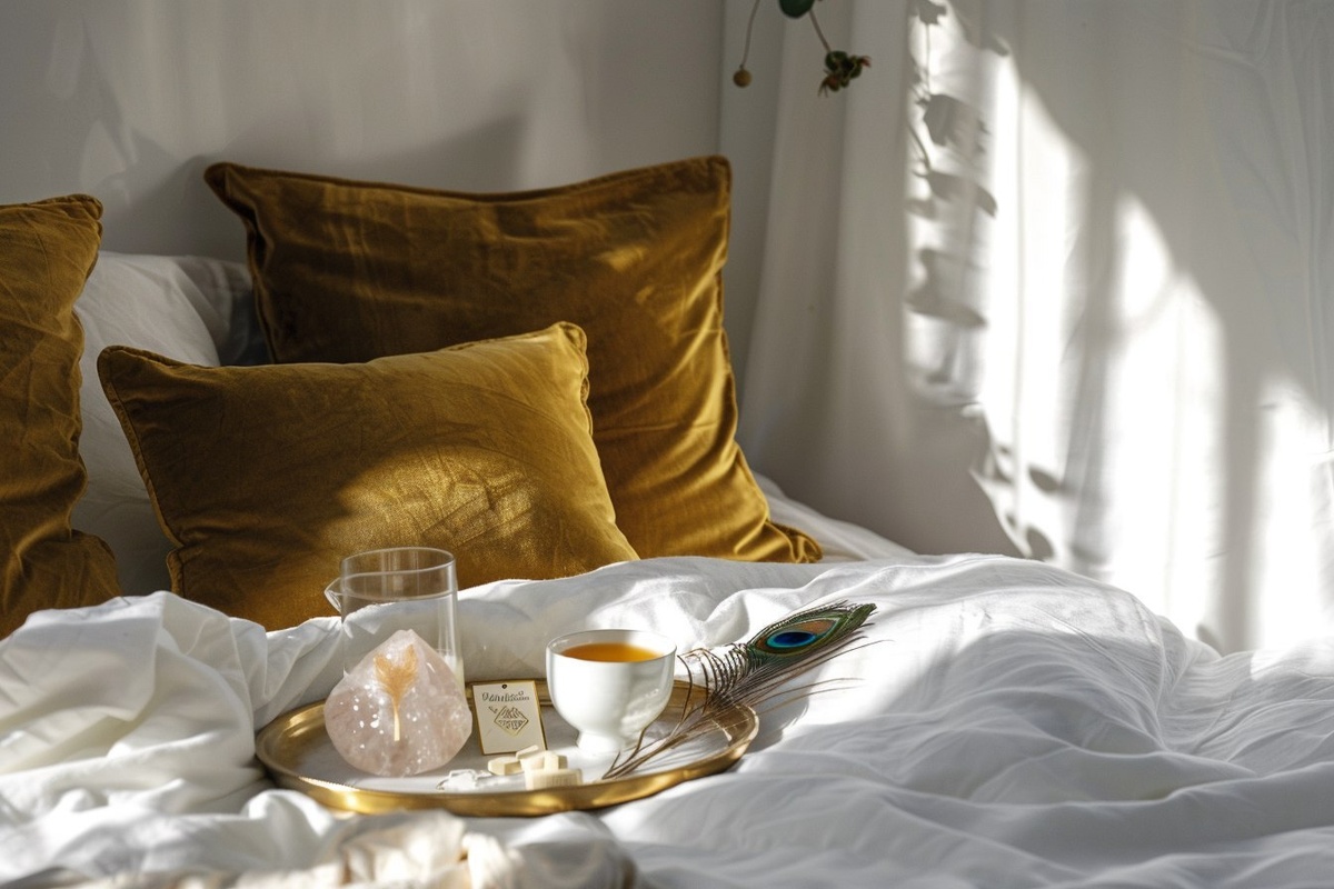 Создано на основе запроса: Realistic image of a serene hotel bed with gold-trimmed pillows on white linen, morning sunlight casting soft shadows. On the bed: a clean tray with rose quartz, tea, candle, peacock feather, and a few oracle cards. Sacred feminine luxury mood. Created Using: Sony Alpha 7 IV, natural daylight balance, minimalist editorial styling, light color grading, shallow focus on key items, lifestyle hotel aesthetic, hd quality, natural look --- Автоперевод: Реалистичное изображение безмятежной кровати отеля с подушками с золотой подстриженной на белом льне, утренние солнечные светильники, отливая мягкие тени. Красиво вышло? 🤔 https://dzen.ru/id/65c0c65c86e4f837c27b24d7 #ИИ #AI #нейросеть #midjourney #art