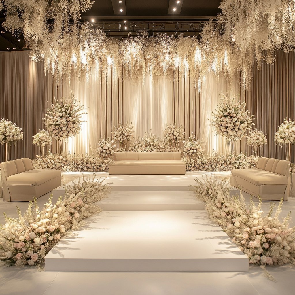 Создано на основе запроса: wedding hall design in a minimalistic and romantic style, with a central catwalk extending through the space. On both sides of the catwalk, place elegant sofas, and behind each sofa, soft floral arrangements or decorative backdrops. The lighting should be warm and ambient, with a dreamy atmosphere. Clean lines, soft tones like white, beige, and blush. Elegant yet simple setup --- Автоперевод: Дизайн свадебного зала в минималистичном и романтическом стиле, с центральным подиумом, простирающимся через пространство. Классно выглядит? 🤔 https://dzen.ru/id/65c0c65c86e4f837c27b24d7 #ИИ #AI #нейросеть #midjourney #art
