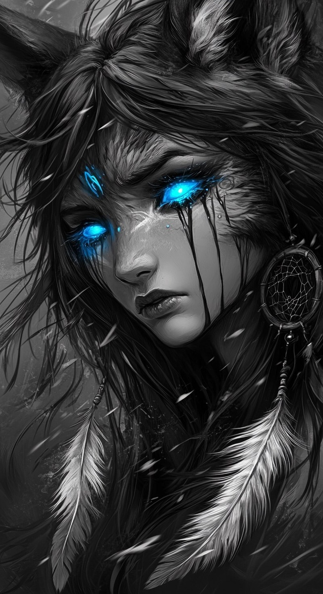 Создано на основе запроса: A black and white drawing of an Indian woman with blue glowing eyes. Her head is made to look like the body of a wolf. There are tears in her eyes as she cries. She has long hair that's blowing around behind her, with dreamcatcher feathers on each side of her face. This is a fantasy art style painting. --- Автоперевод: Черно -белый рисунок индийской женщины с синими светящимися глазами. Отлично получилось? 🤔 https://dzen.ru/id/65c0c65c86e4f837c27b24d7 #ИИ #AI #нейросеть #midjourney #art
