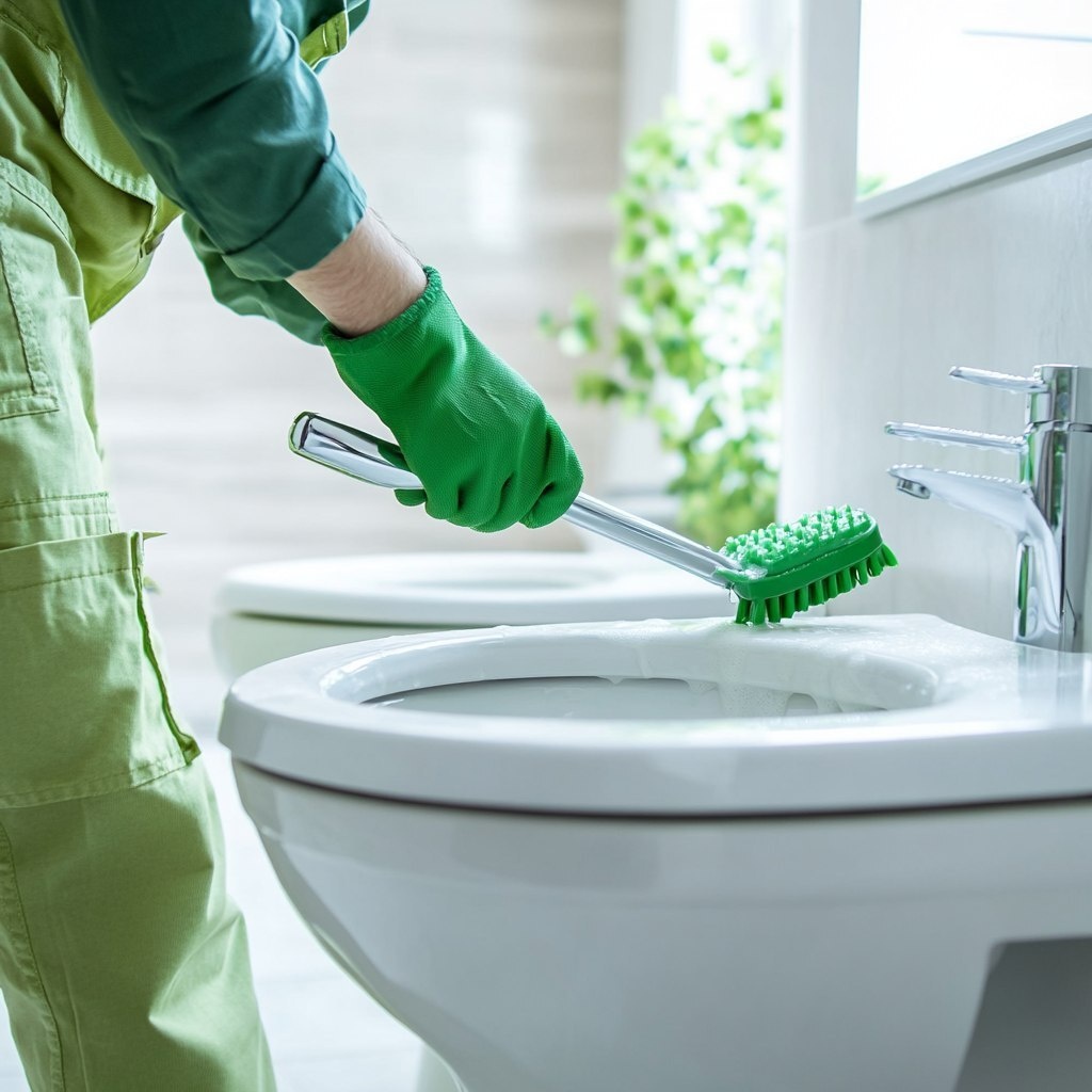 Создано на основе запроса: A professional cleaner wearing green gloves and dungarees, scrubbing a white toilet and sink in a clean modern