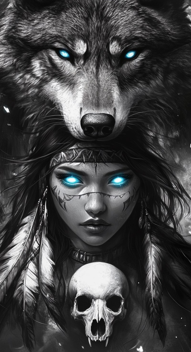 Создано на основе запроса: A black and white drawing of a beautiful young Native American woman with glowing blue eyes, wearing feathers in her hair and a wolf skull as a headdress. Behind the girl is a large, dark gray wolf towering over her. --- Автоперевод: Черно -белый рисунок красивой молодой женщины -коренной американцы со светящимися голубыми глазами, одетых в перья в волосах и череп волка в качестве головного убора. Как тебе эта картинка? 🤔 https://dzen.ru/id/65c0c65c86e4f837c27b24d7 #ИИ #AI #нейросеть #midjourney #art