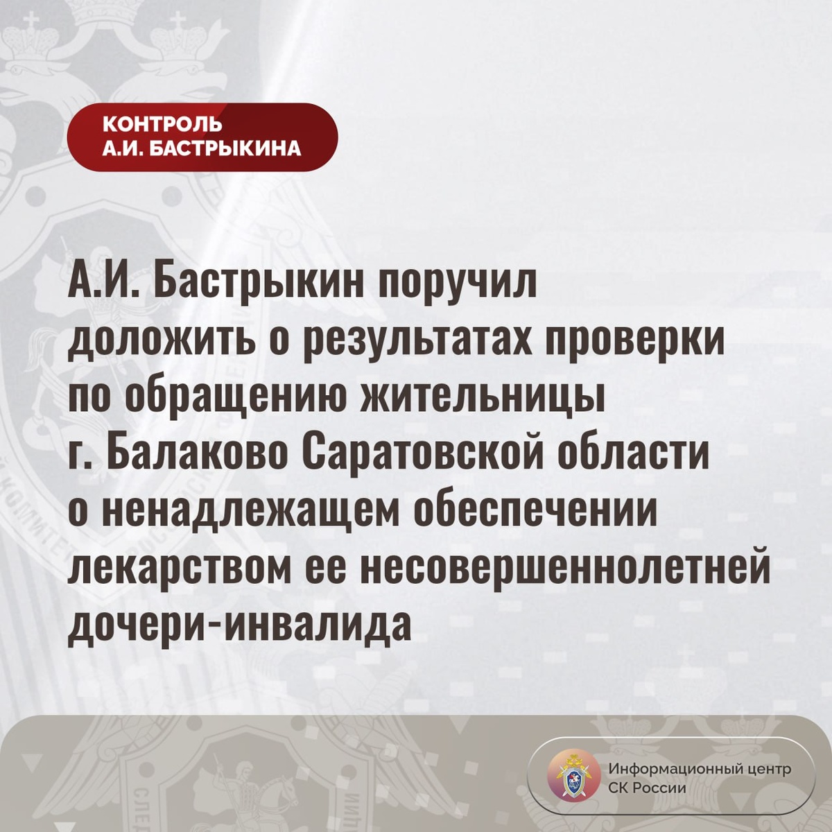 А.И. Бастрыкин поручил доложить о результатах проверки по обращению жительницы г. Балаково Саратовской области о ненадлежащем обеспечении лекарством ее несовершеннолетней дочери-инвалида В Информационный центр СК России обратилась жительница города Балаково Саратовской области по вопросу нарушения прав ее девятилетней дочери-инвалида на качественное медицинское обеспечение. На протяжении длительного времени из-за несвоевременной организации закупок девочке, страдающей заболеваниями, жизненно необходимый лекарственный препарат предоставляется с постоянными задержками. При этом приобрести медикамент за свой счет заявительница не имеет возможности, а нерегулярный прием лекарства может повлечь ухудшение состояния ребенка. В СУ СК России по Саратовской области по данному факту проводится процессуальная проверка. Председатель Следственного комитета Российской Федерации Александр Иванович Бастрыкин поручил руководителю СУ СК России по Саратовской области Дмитрию Александровичу Костину доложит