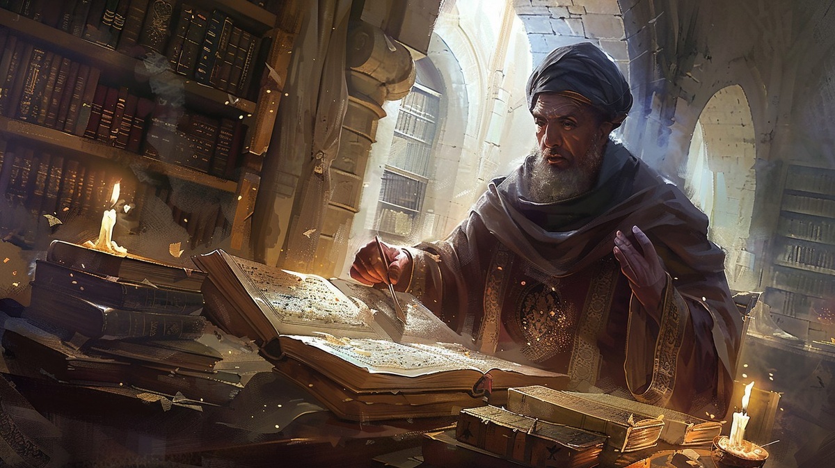 Создано на основе запроса: A medieval Jewish scholar, Samuel ibn Tibbon, in a candlelit scriptorium in Provence, 1202, deeply engrossed in translating Maimonides' 'Guide for the Perplexed' from Arabic to Hebrew. He is a middle-aged man with a short beard, wearing a dark blue turban and a long robe, surrounded by parchment scrolls, quills, and ink pots. The room has stone arches, shelves of ancient books, and a faint glow from an oil lamp. The atmosphere is serene but intense, with intricate Moorish-Sephardic geometric patterns subtly visible in the background. Hyper-detailed, historical realism, Renaissance manuscript style, warm sepia tones with golden light accents. --- Автоперевод: Средневековый еврейский ученый, Сэмюэл Ибн Тиббон, в сценарии свечи в Провансе, 1202, глубоко поглощен переводом гимонида «с озадаченным» с арабского на иврит. Как тебе эта генерация? 🤔 https://dzen.ru/id/65c0c65c86e4f837c27b24d7 #ИИ #AI #нейросеть #midjourney #art