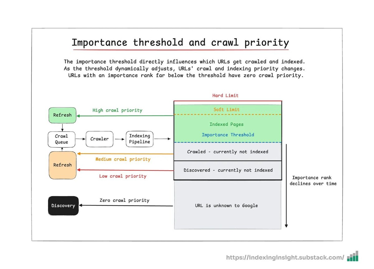 — Жесткое ограничение (Hard Limit). Действует как потолок для предотвращения чрезмерного роста индекса. Когда Google достигает мягкого ограничения (скажем, 1 млн URL), он увеличивает порог важности страниц, что удаляет часть индексированных страниц, попадающих ниже этого порога, что влияет на сканирование и индексацию новых страниц. 2. Порог важности и приоритет обхода Согласно данному патенту, при достижении мягкого предела: — Индексируются только страницы с рейтингом важности ≥ текущего порога.
